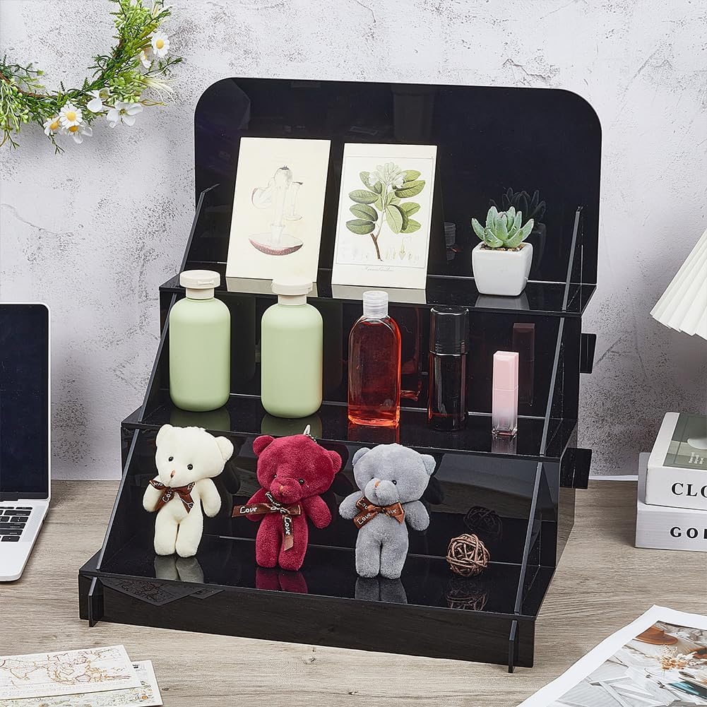 3-Tier Acrylic Display Riser Stands - The Ideal Choice for Your Collections Whether you're an action figure enthusiast eager to showcase your prized collection, a jewelry lover wanting to display your precious pieces, or a store owner aiming to attract customers with an eye-catching display, our 3-Tier Acrylic Display Riser Stands are here to meet your needs. In a living room, these stands can transform a corner into a mini museum of action figures, or in a jewelry store, they can make every gem sparkle. For those who love perfumes, it can be a perfect perfume organizer, neatly arranging different bottles. Dimensions: The overall finished size is approximately 38x41x45cm (14.96x16.14x17.72 inches). It includes various components like a rectangular piece measuring 41x19x0.4cm (16.14x7.48x0.16 inches), 2 triangular pieces of 33x38x0.4cm (12.99x14.96x0.16 inches), 3 rectangular pieces of 41x4.3x0.4cm (16.14x1.69x0.16 inches), 2 rectangular pieces of 41x9.9x0.4cm (16.14x3.90x0.16 inches), and 3 rectangular pieces of 41x12x0.4cm (16.14x4.72x0.16 inches). Color: Black. Sold as 1 set.