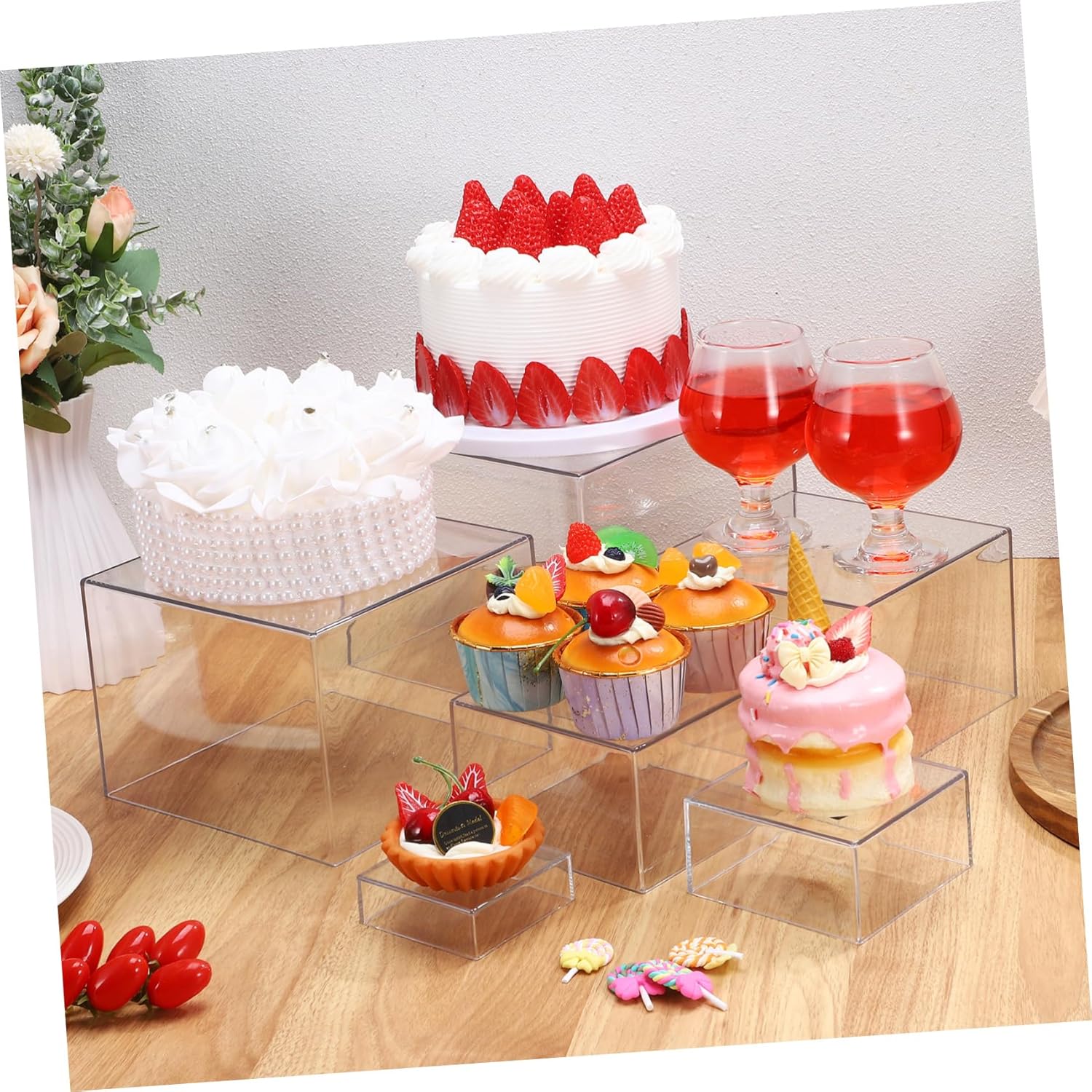 Package List 6 x food risers Features -Flexible usage: designed to fit various dessert sizes, this stand is perfect for birthdays, weddings, tea parties, and more dessert holder -Optimized display area: tiered design offers an organized and visually appealing way to showcase your cakes and treats wedding party cake rack -Material:Acrylic clear dessert stands -Buffet risers and stands: impress your guests with a dessert stand that combines functionality with a stylish and modern look cake stands for dessert table -Effortless maintenance: easytoclean surface minimizes cleanup time, allowing a clean dessert presentation cake stand wedding -Size:20.00X20.00X15.00cm/7.86X7.86X5.89in decorative cupcake stand -Color:Transparent dessert table stands -Userfriendly mobility: lightweight materials make it simple to move and store, catering to both personal and professional needs tea cake standGoods Descriptioncupcake dessert candy holder Its clear design allows your treats to take the spotlight, while the sturdy construction allows they stay securely in place.dessert candy display plate Ideal for showcasing a variety of desserts, this stand is perfect for parties, events, and everyday use, providing a practical and stylish solution for your display needs.cake holder stand for party Make your dessert table the center of attention with this versatile cake display rack