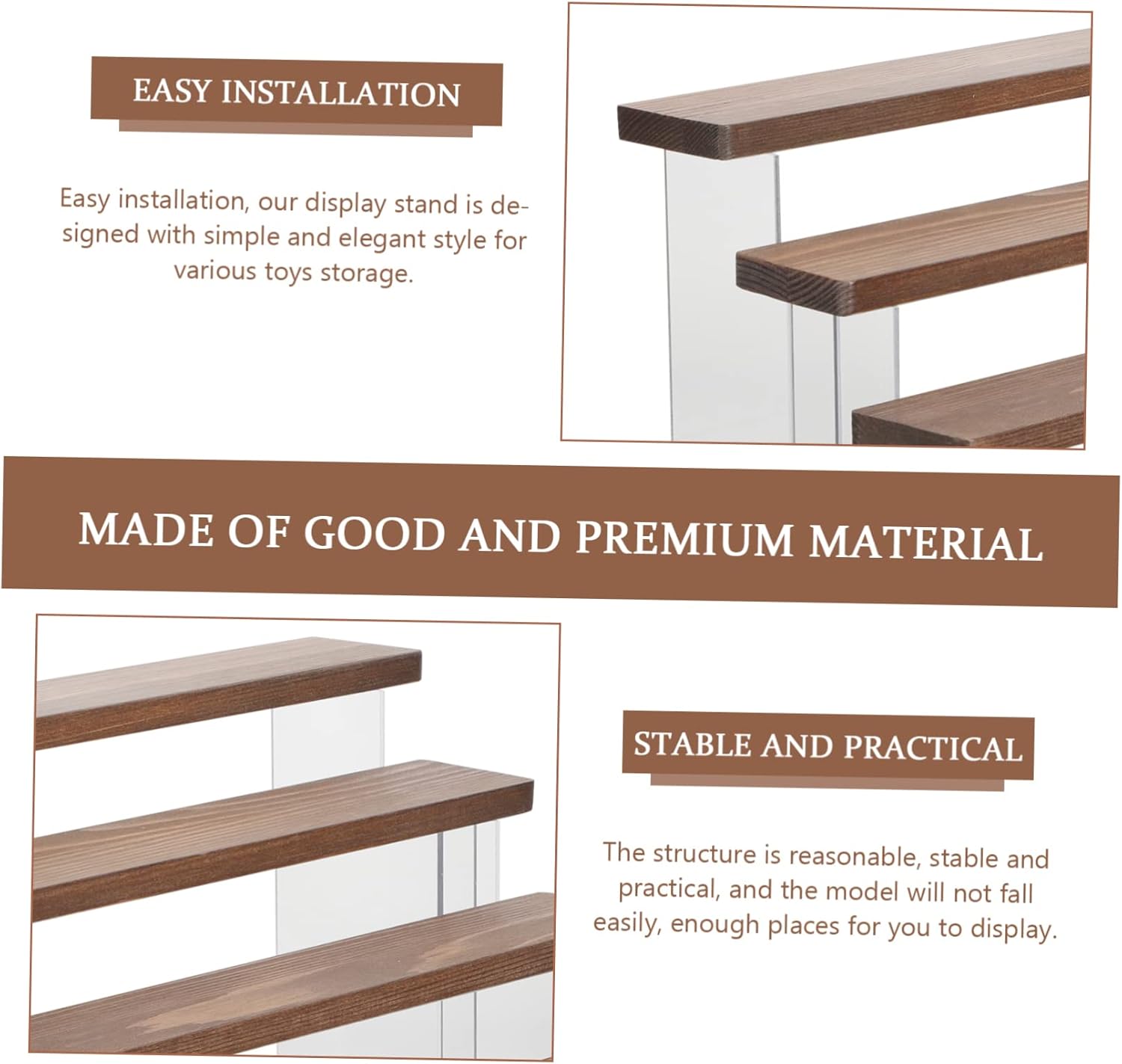List 1 x Display Rack Characteristics - Size: About 30.00X22.00X17.00cm/11.79X8.65X6.68in display shelf - Color: Light Brown acrylic display stand - Material: Acrylic, wood model display stand - Designed for storage and display of statuettes, dolls, stable and practical, and can serve you well display rack. - Easy installation, 4-tier stand design with simple and elegant style for various doll storage car model display rack. - Fine workmanship, with smooth texture, not easily broken, easy to clean, and can be reused acrylic wood figures stand. - Well-made of and sturdy materials, safe and practical for using time doll display rack. - The structure is reasonable, stable and convenient, and the small model will not fall easily acrylic riser display stand.Goods Information4-tier storage holder You can display your model without being by the other one.car model display rack Great idea for Christmas, birthday or any occasion.display shelf A 4-tier display stand, simple and useful design, for storing or displaying your favorite collection and decoration