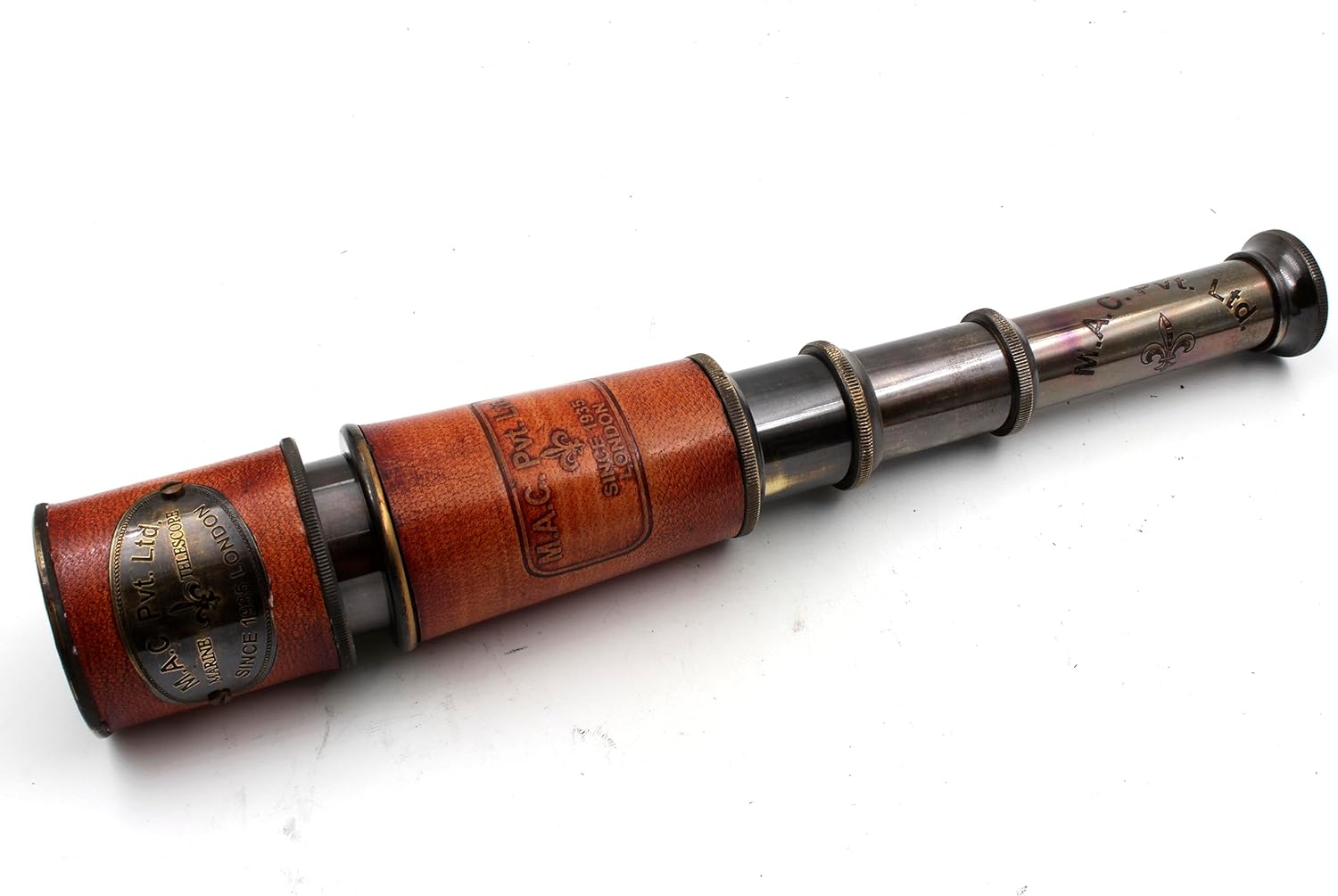Handcrafted Vintage Replica Telescope comes with a finely polished beautifully handcrafted wooden case. The nautical handled telescope magnifies far away objects and landscapes with a clear image, with just a push on the eyepiece in or out to bring the image into clear focus. The scope extends to a full 15" and can retract to fit into its own wooden box. This item is of antique elegant design which could also be an addition to your home decor, restaurants and office. Beautiful telescope replica made of solid brass with a wooden case of very fine quality, this item can be gifted to loved one or to the collectables lover. This telescope has 4 moving tubes which add to its look and feel, and are used to focus far distance objects. This vintage telescope is manufactured to reflect the workmanship and materials of a more elegant bygone age. A must-have vintage look telescope. Our Beautiful handicraft telescope made from excellent quality brass stylish golden antiquated vintage burn look. Our solid brass and leather telescope is an amazing gift to give on a wide range of occasions, whether it's someone about embark on a gap year travelling or for others starting a new journey either with a new job, getting married or retiring. This is fully functioning quality reproduction of antique brass telescope used in olden times. It is a great imitation of vintage spyglass. It focuses and magnifies due to the excellent optics for real viewing. This is 3 draw Brass Nautical telescope. This pirate spyglass replica has a sliding sunshade cover, which pulls out to reduce glare in bright light. Unique design made of shiny brass finish solid brass with fully hand made wooden case. Its historic bronze finish makes it look real vintage telescope. It uses push and pull mechanism to focus distant objects. It needs to pull out entirely and slowly push the barrel inside, while looking through the telescope, till the desired object becomes clear. This handheld telescope is a unique gifting opti