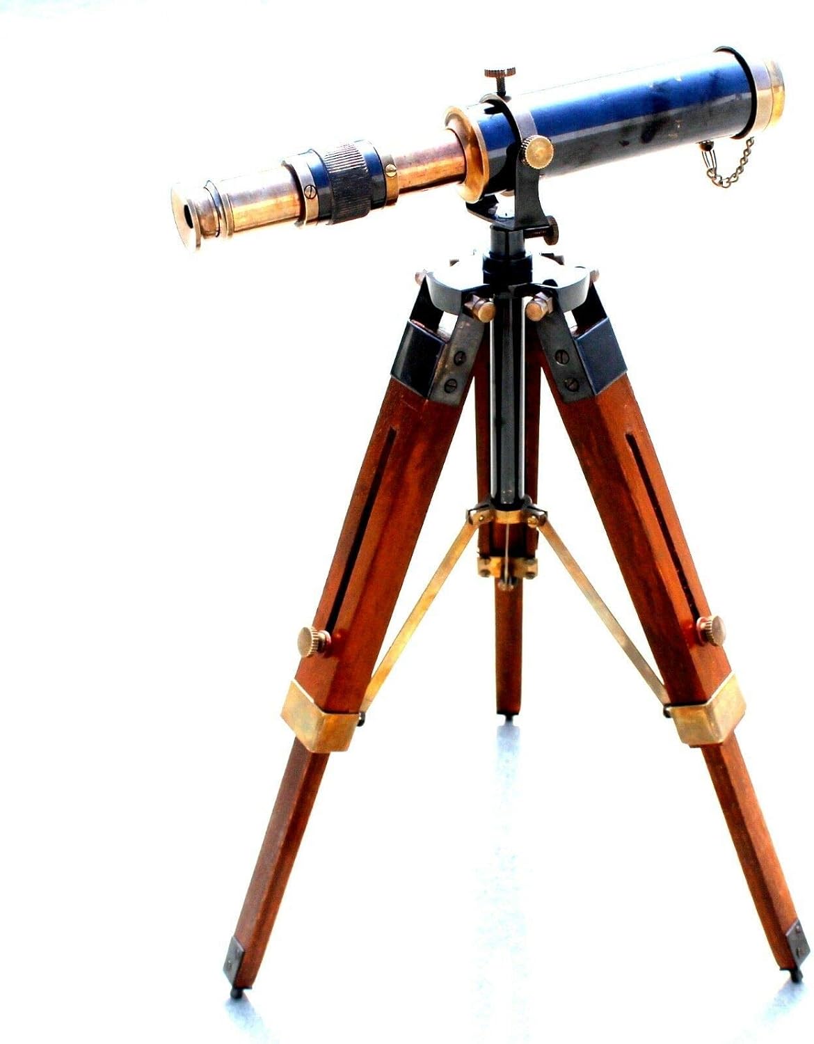 autical Single Barrel Brass Telescope with Wooden Tripod. ANTIQUE Elegant look of Telescope adds a ROYAL Class to your Home,Terrace,Balcony. Wooden Tripod is specially designed to match Home Furniture. AN EXCELLENT NAUTICAL GIFT SIZE Telescope :- 10" Inches (Approx) Color :- Antique finish Material :- Solid Brass/Wood Nautical Telescope height is 12" approx when center bar and all three legs are closed. Total maximum height is 15 inches approx. Telescope appeared in 1608 and is credited to Hans Lippershey. Since then there have been development in this field. So we have reproduced the antique version of tripod ship telescope. This classic solid brass harbor master telescope on mahogany tripod has excellent optics for viewing far away objects such as approaching ships. These have same magnification as were in the ancient one’s. You may use this telescope for decoration purpose in your bed room, balcony, offices it will give you royalty status this will give you an eloquent look to your home and offices.