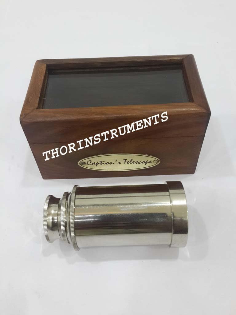 Vintage Beautiful Chrome Finish Telescope with wonderful Brown Glass Wooden Box.It has excellent optics for real viewing and would make a wonderful usable nautical decor in any office, boat or home.