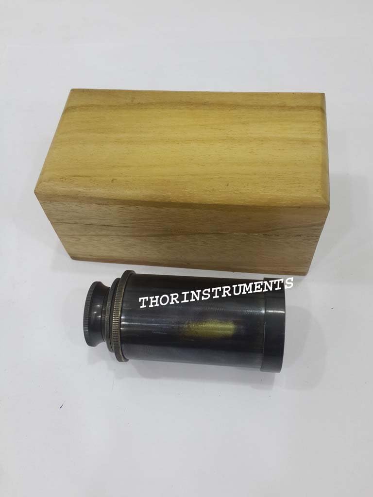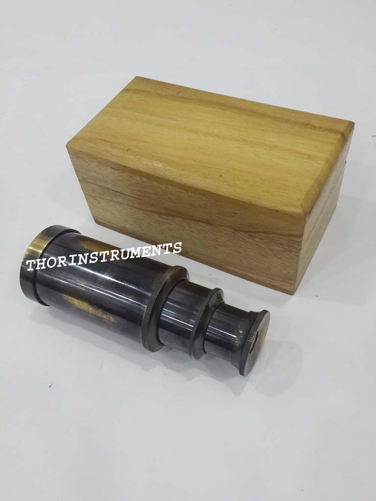 These beautifully crafted, hand-polished, solid brass telescope have been manufactured to reflect the workmanship,This nautical spyglass is made of brass.The telescope, when fully extended, is about 6" long. The scope comes in a Natural wooden nautical box.