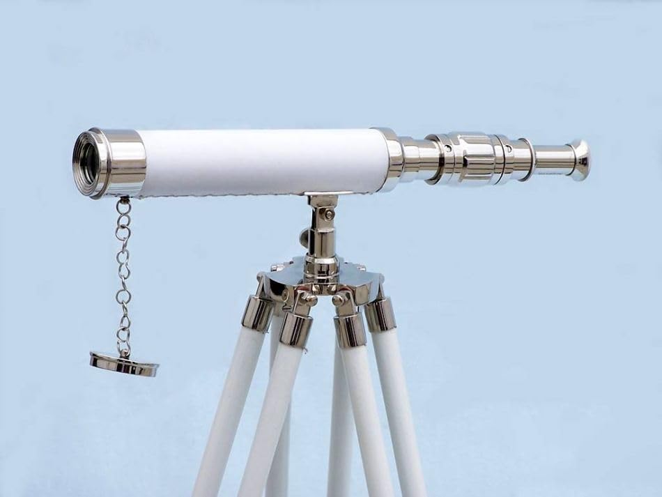 A Modern Twist on Timeless Exploration This Nickel Brass Single Barrel Telescope, wrapped in elegant white leather, combines classic design with a fresh, modern touch—making it the perfect decorative and inspirational gift for a child or young explorer. Inspired by the iconic Griffith Astro style, this vintage-look telescope rests on a solid wooden tripod stand, making it a functional and decorative centerpiece for any nautical, space-themed, or educational setting. Though not intended for professional stargazing, it serves as a symbolic introduction to exploration, science, and curiosity. Perfect for bedrooms, playrooms, or study spaces, this telescope makes a thoughtful gift that inspires learning and creativity.