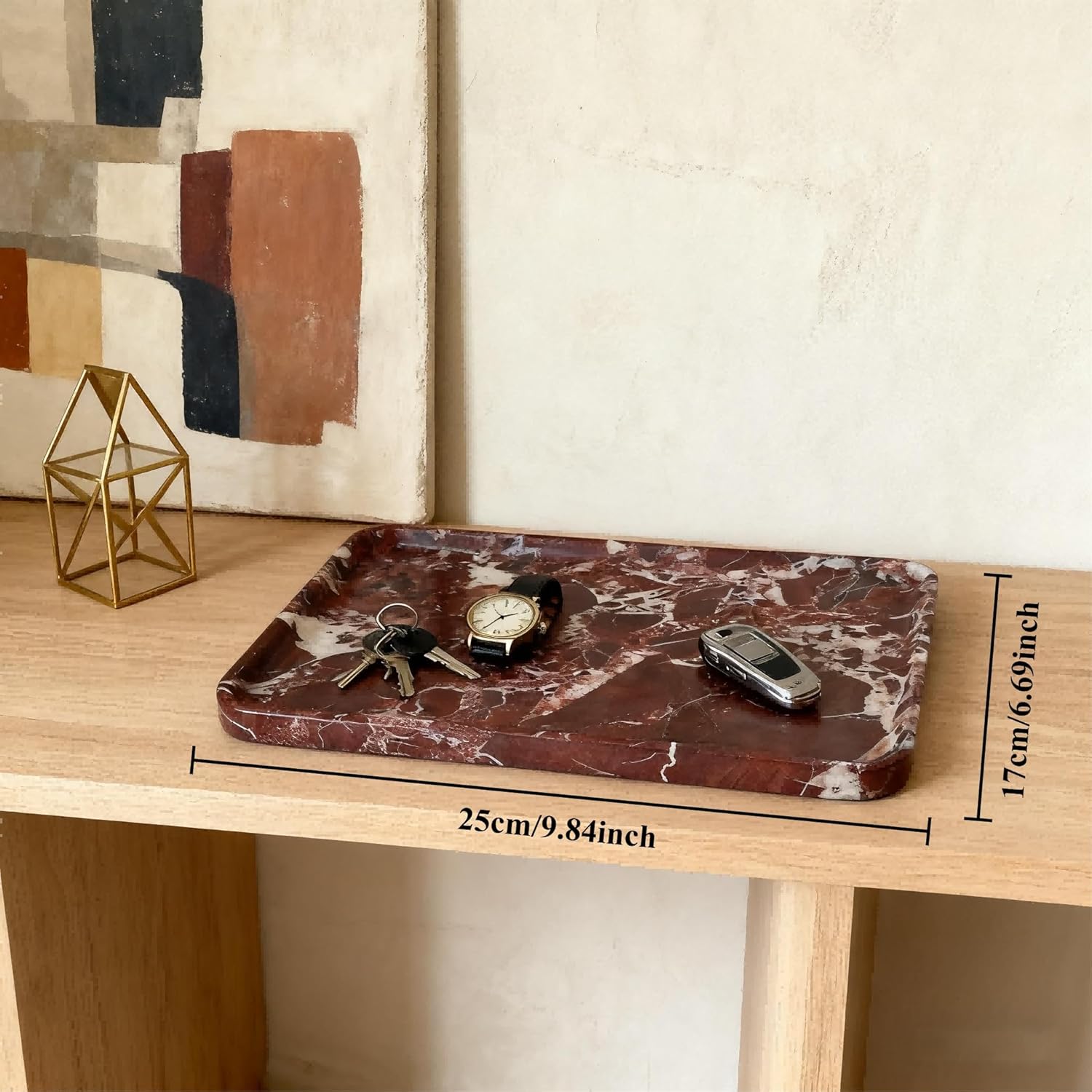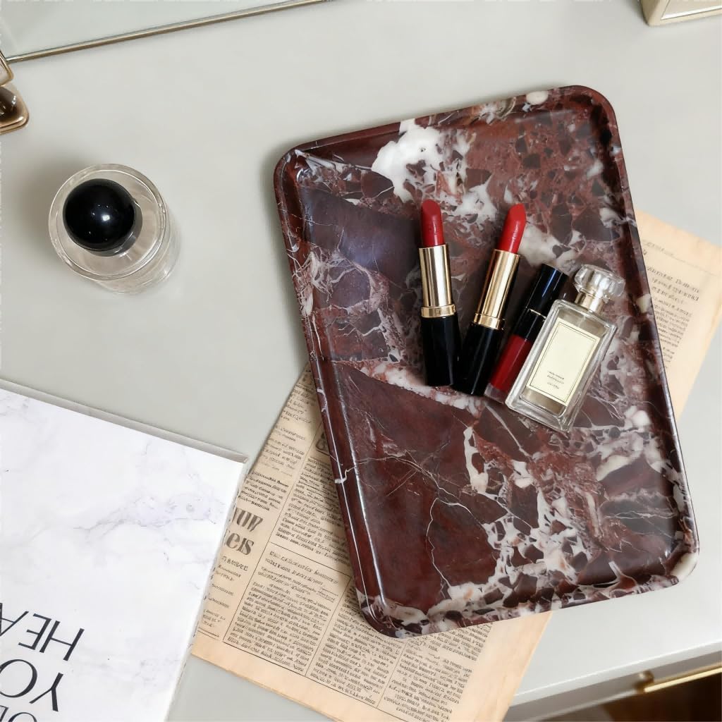 Elevate your home decor with this stunning purple-red marble serving tray, featuring an exquisite natural stone pattern with dramatic white veining that makes each piece uniquely beautiful. The sophisticated design showcases the rich, deep tones of the stone, creating a luxurious accent for any room. Perfect as a decorative vanity organizer in your bathroom for perfumes and cosmetics, or use it in your living room to display candles and ornaments. The versatile tray also works wonderfully in the kitchen for serving drinks or organizing small items. Its smooth surface and raised edges ensure items stay secure while adding an elegant touch to your space. The durable stone construction offers both functionality and timeless beauty, making it an ideal choice for those seeking to add a touch of sophistication to their home decor. The tray's generous size provides ample space for organization while maintaining a sleek profile that complements any interior style.