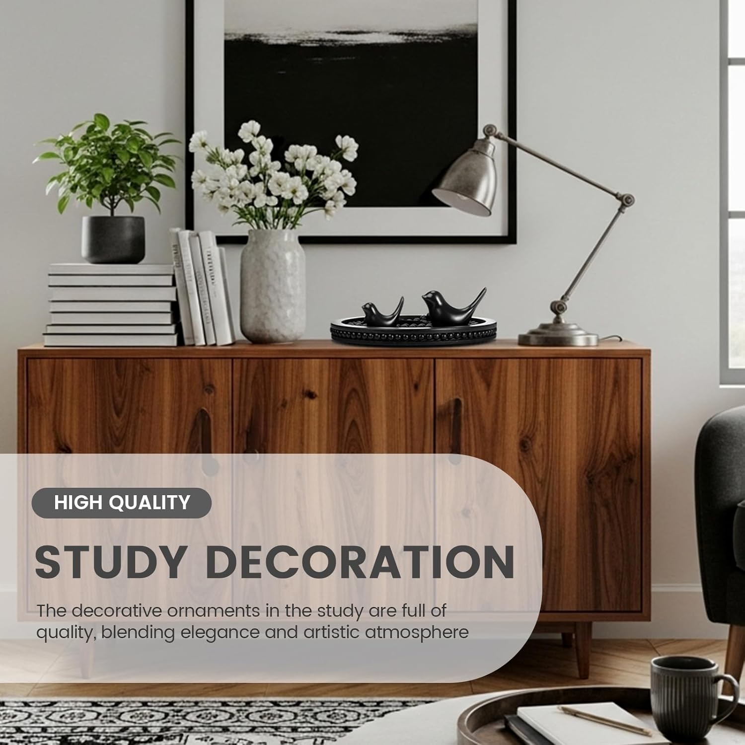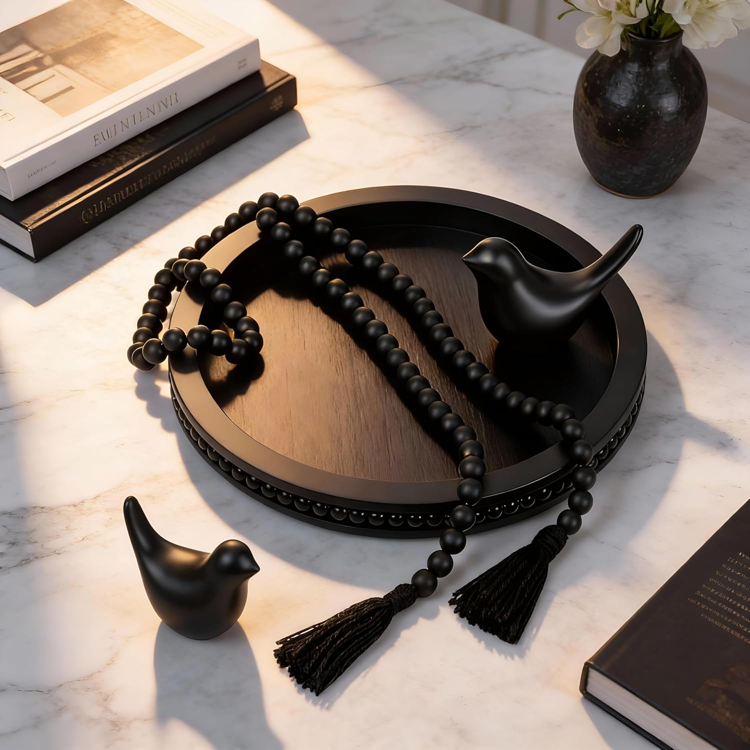 Features: Thoughtful Gift Choice This rustic farmhouse tabletop round wooden tray set makes a thoughtful gift, ideal for friends setting up a new home or for creating an elegant and cozy ambiance. It's also a meaningful present for classmates, teachers, colleagues, or cherished siblings, conveying your thoughtfulness and remembrance, and adding charm to any recipient's decor. Ambient Sophistication Every piece in the Round Wooden Tray Set comes together to create an inviting, elegant, and ideal style. Each item individually can serve as decoration in homes, offices, parties, or weddings, enhancing atmosphere and sophistication effortlessly, making it a versatile choice for any decorative setting. Specifications: Material: ceramic, wooden Color: black Size: Tray: 11.8 inches in diameter, 1.18 inch in height Wooden beads: 0.63 inches in diameter, 58 inches in length Bird statues: 3 x 2.6 x 1.5 inch, 4.4 x 3.1 x 2 inch Package includes: 1 x Tray 1 x Wooden bead 2 x Bird statue Notes: Manual measurement, please allow slight errors on size. The color may exist a slight difference due to different screen displays.