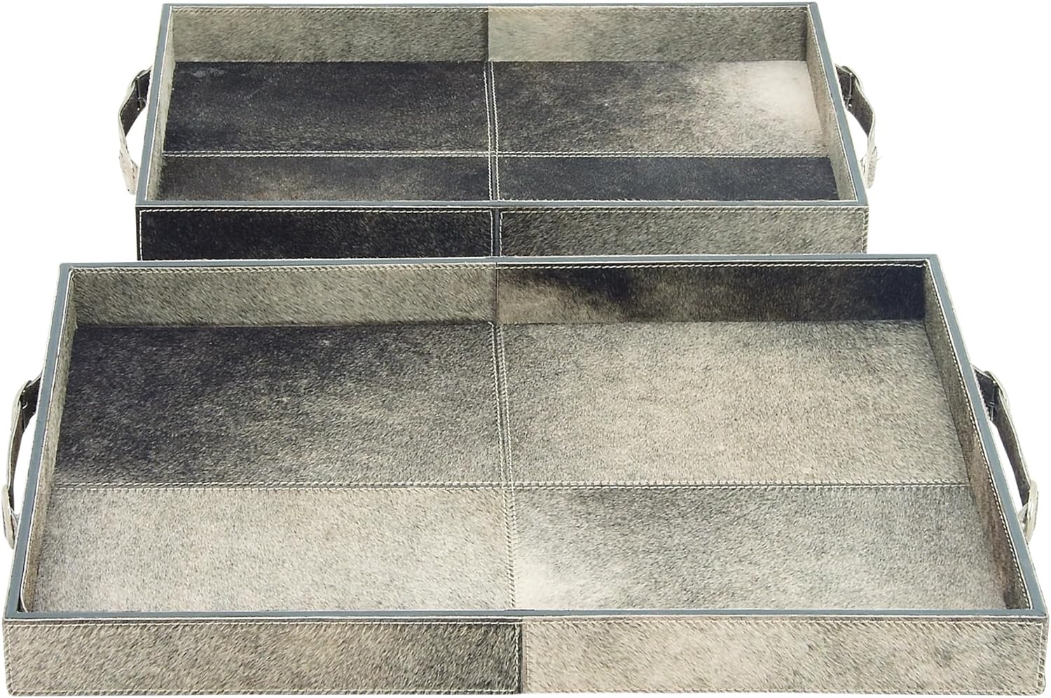 A storage piece that is spacious for your trinkets or decorative goods on your mantle, coffee table or kitchen counter. A versatile piece for storage or as a decorative display on any surface space. These elegant leather desk trays are an ideal tray for papers, documents, and lightweight office materials. This item ships in 1 carton. Please note that this item is for decorative purpose only and is not food safe. Mdf tray makes a great gift for any occasion. Due to the handmade nature of this item, no two will be alike, there will be slight differences in shape, size, and color. Suitable for indoor use only. Leather and hair on hide are natural products, and therefore no two will be alike. There may slight variations in pattern, natural blemishes, colors, and overall aesthetic of the product. Made in India. This tray comes as a set of 2. Traditional style.