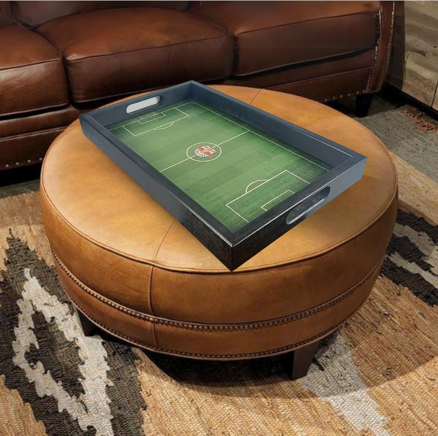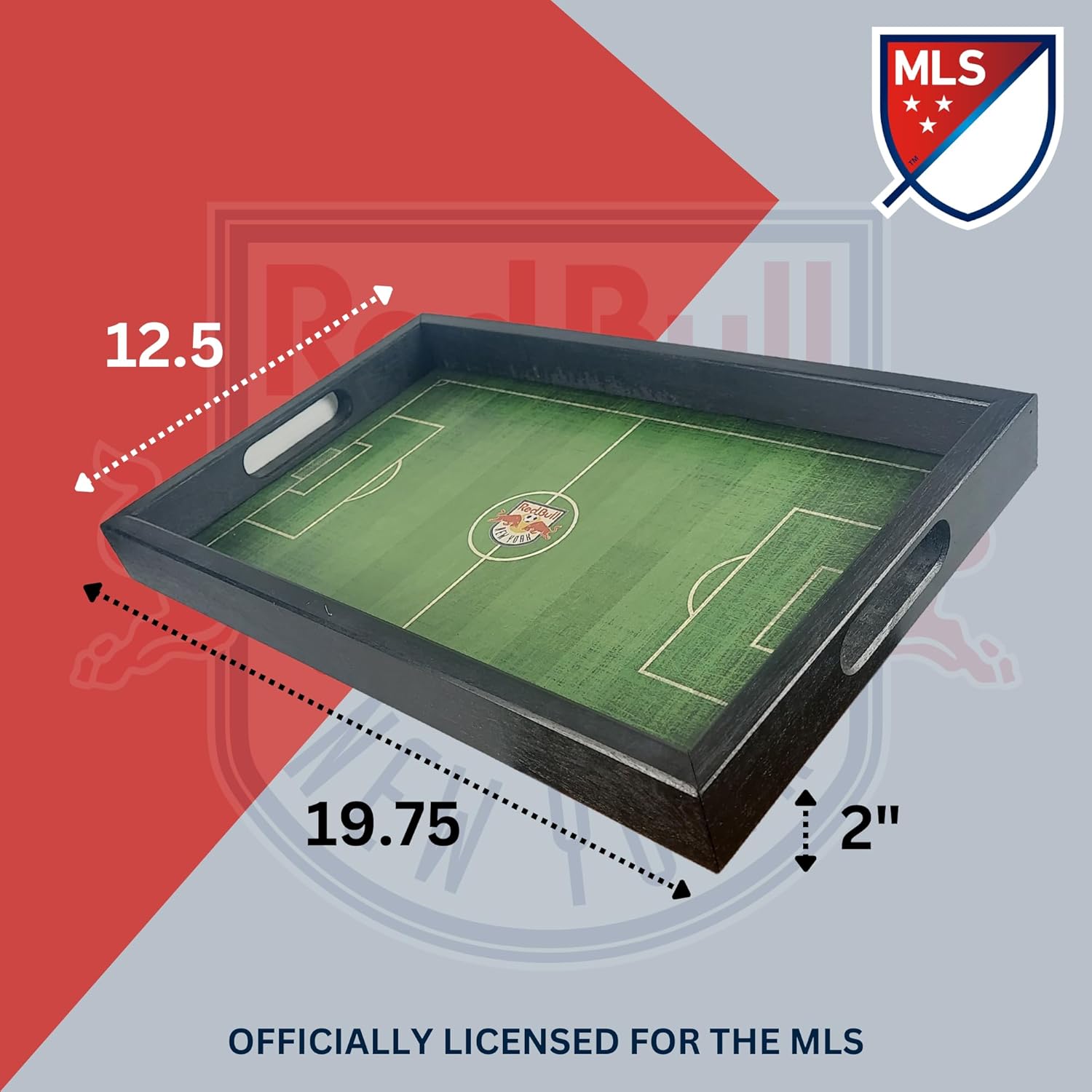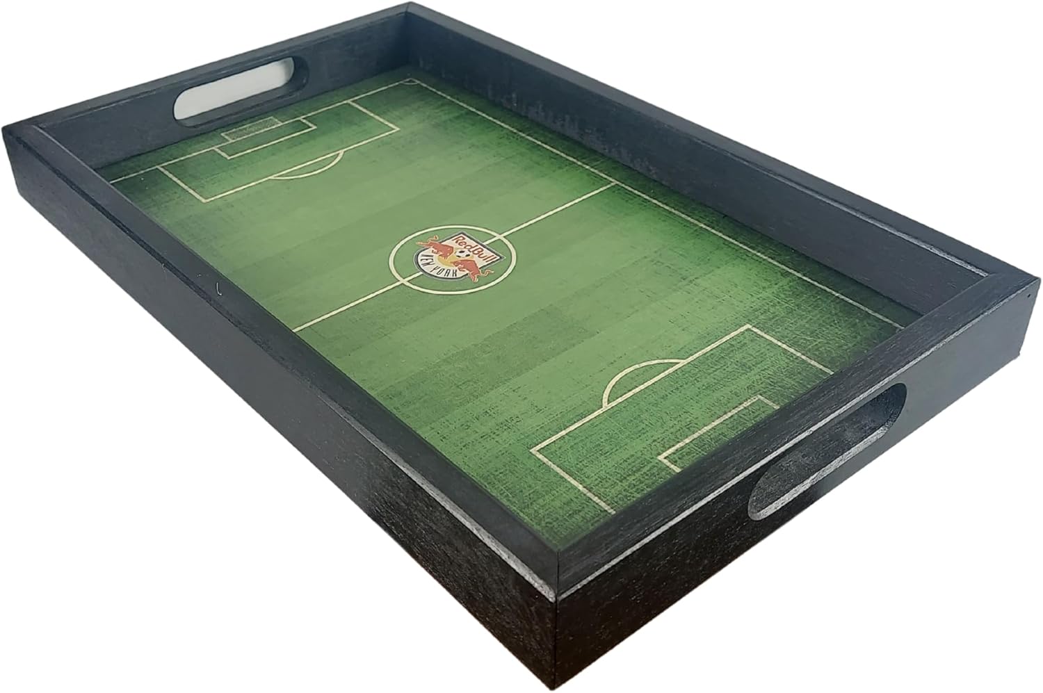 New York Red Bulls MLS Field Tray by Fan Creations - Decorative Team Logo Server with Handles for Food & Drink - For Soccer Game Day Entertaining or Tabletop Organizer - Show Your Red Bulls PrideAdd to your New York Red Bulls decor in your home! Made from high-quality medium-density fiberboard, this New York Red Bulls field tray is the perfect way to liven up match day while staying well-supplied with your favorite snacks and drinks for all 90 minutes. The helpful handles and stylish wooden pattern are just as sure to turn heads as the print of the pitch, and solidify your status as a serious Red Bulls fan.In the offseason, this tray is an excellent tool in the den or man cave to keep your television remotes, video game controllers, and other multimedia devices organized on your coffee table, or as a home for your keys and mail by the front door, letting your guests know from the moment they walk in, to the moment they sit down, who your team is.Not intended for food to be placed directly on the tray. The tray measures 19.75in x 12.25in x 2in.