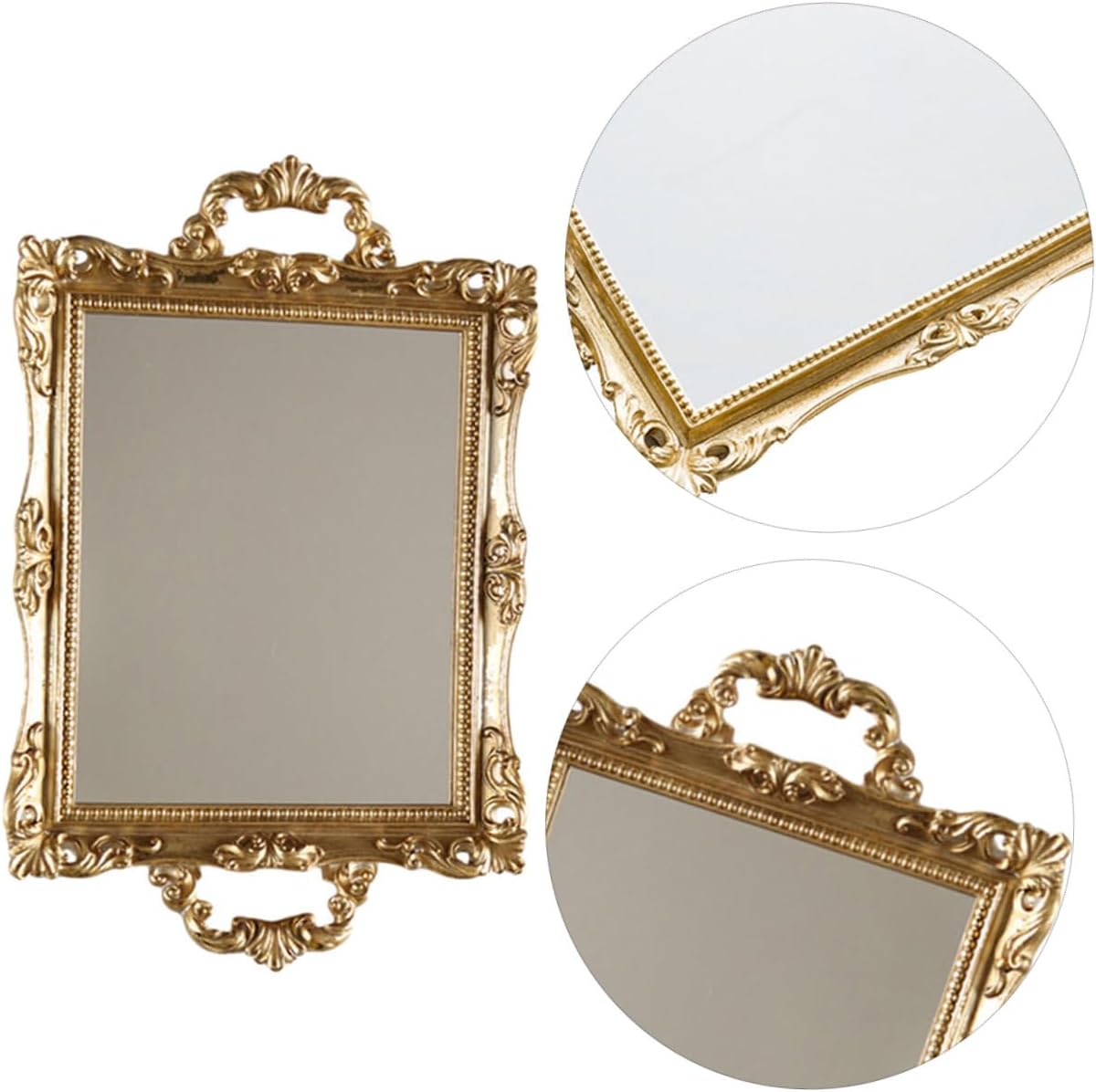 Package List 1 Characteristics - Color: golden. - Size: About 36.80X23.00X5.00cm/14.49X9.06X1.97inch. - Material: resin and glass mirror. -Product Info:Mirror tray - Brand-new and great quality, good for you to store small items like some cosmetics and small jewelries luxury tray. - Perfect for wedding party, home, office, hotel and so on, etc mirror plate tray. - and premium glass and resin material, it is safe and to use. - With fine craftsmanship, looks beautiful and elegant, a nice decor for your home mirror tray decorative. - Great for displaying cake, dessert, fruit, candy, chocolate, pastry and more dressing table tray.Goods Informationvanity tray Made of premium resin and glass material, and practical.mirror plate tray This Nordic style retro mirror tray can hold many small things such as keys, fruit, perfume, cosmetics and so on.vintage mirror tray Do you want to have an storage mirror tray? If yes, our item is your a good choice