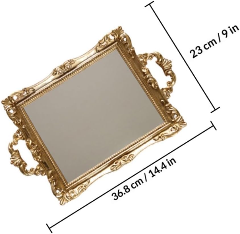 Package List 1 Features -Product Info:Mirror tray - Size: About 36.80X23.00X5.00cm/14.49X9.06X1.97inch. - Color: golden. - Material: resin and glass mirror. - Whether as a photo prop or home furnishing are very appropriate luxury tray. - Fine workmanship, polished smooth, elegant and delicate look, very practical mirror plate. - Can be used for wedding dessert table decor, delicate and beautiful mirror vanity tray. - resin and glass mirror material, safe and also decorative for you to use. - The retro carved Nordic style decorative storage mirror tray, very textured mirrored tray for vanity.Goods Descriptionmirror vanity tray Are you still looking for an and multi-purpose storage mirror tray? Our product can meet your needs.dressing table tray Very fashionable and chic, with the design of Nordic style retro carved pattern design.mirror table tray It is widely used for dining table, kitchen, toilet and other places