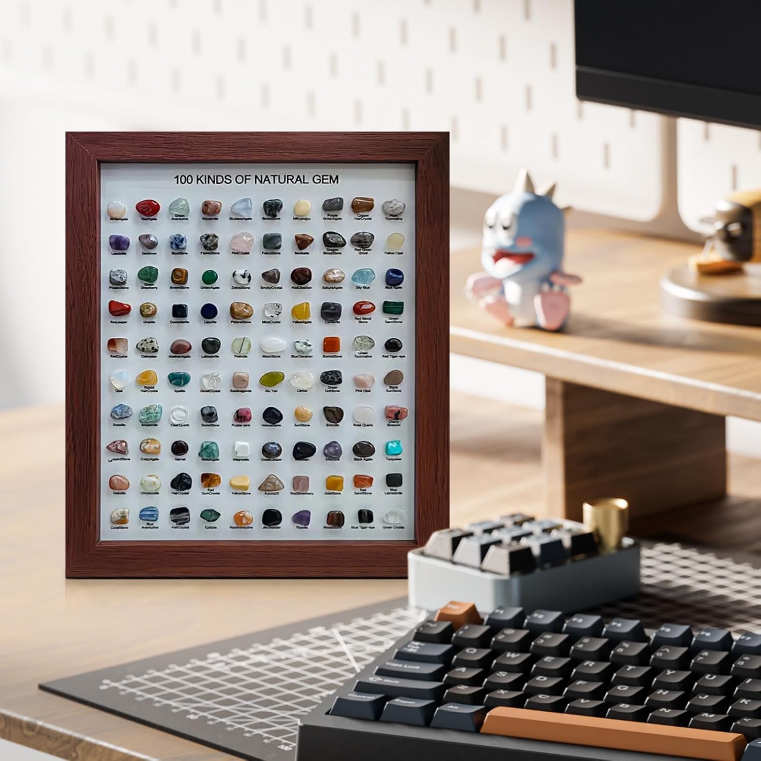 Product List: 1 x Picture Frame (Dimensions: 23 x 28 cm) 100 x Natural Crystal Stones (Sizes: 1.9-2.5 cm) 1 x Set of English Labels for Identification Suitable for Decoration, Gift Giving, and Educational Purposes Material:Natural minerals including crystals, agates, fluorites, and other varieties Color:Varied natural colors depending on the type of stone included in the set Dimensions:Picture Frame: 23 x 28 cm Stones: Sizes range from 1.9 to 2.5 cm Features: Comprehensive Collection: Includes a diverse selection of 100 natural mineral specimens, perfect for enhancing any space or as an educational tool.I ncluded Picture Frame: Comes with a stylish 23x28cm frame to display your favorite stones or create a unique decorative piece. English Labels Provided: Each stone comes with an identification label, making it easy to learn about and categorize each specimen. Versatile Usage: Ideal for home decor, gifting, classroom teaching, and personal collections. Natural Beauty: Each stone is hand-selected for its natural beauty and uniqueness, adding a touch of elegance to any setting.