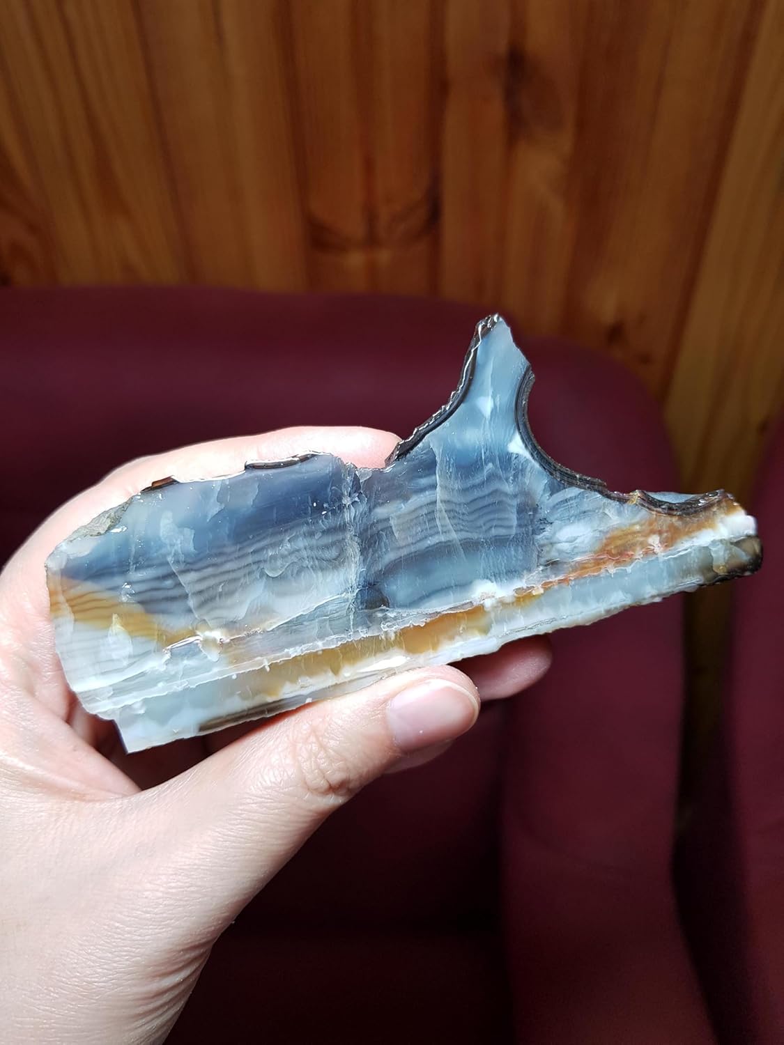 Weight: 147 g Watercolor Seascape Agate | Blue, White, and Gray Waves with Golden Yellow Band Experience the serene beauty of this Watercolor Seascape Agate, a breathtaking natural stone reminiscent of a tranquil ocean view. Featuring wave-like formations in soft blue, pure white, and gentle gray, this agate mirrors the fluid motion of the sea meeting the sky. A striking golden yellow band flows through the center, adding warmth and radiance, like sunlight shimmering on the horizon. This long and wide agate stone evokes the artistry of a seascape painting, making it a perfect centerpiece, collector’s item, or thoughtful gift for those who cherish nature’s splendor. Its polished surface enhances the intricate patterns, inviting quiet reflection and harmonious energy into any space. Metaphysical Properties: Tranquility and Flow: The calming blue and white tones promote relaxation, clarity, and emotional balance, encouraging a state of peaceful flow. Stability and Strength: The grounding gray hues anchor your energy, helping you feel secure and connected to your surroundings. Inspiration and Vitality: The golden yellow band symbolizes optimism, creativity, and motivation, inspiring positive energy and self-expression. Harmonious Energy: This agate is believed to unify opposing energies, creating inner balance and fostering a deep sense of peace and connection. Let this Watercolor Seascape Agate bring the soothing essence of the ocean into your life. Whether displayed as a work of art or cherished for its metaphysical properties, this stone is a stunning reminder of nature’s boundless beauty and harmony.