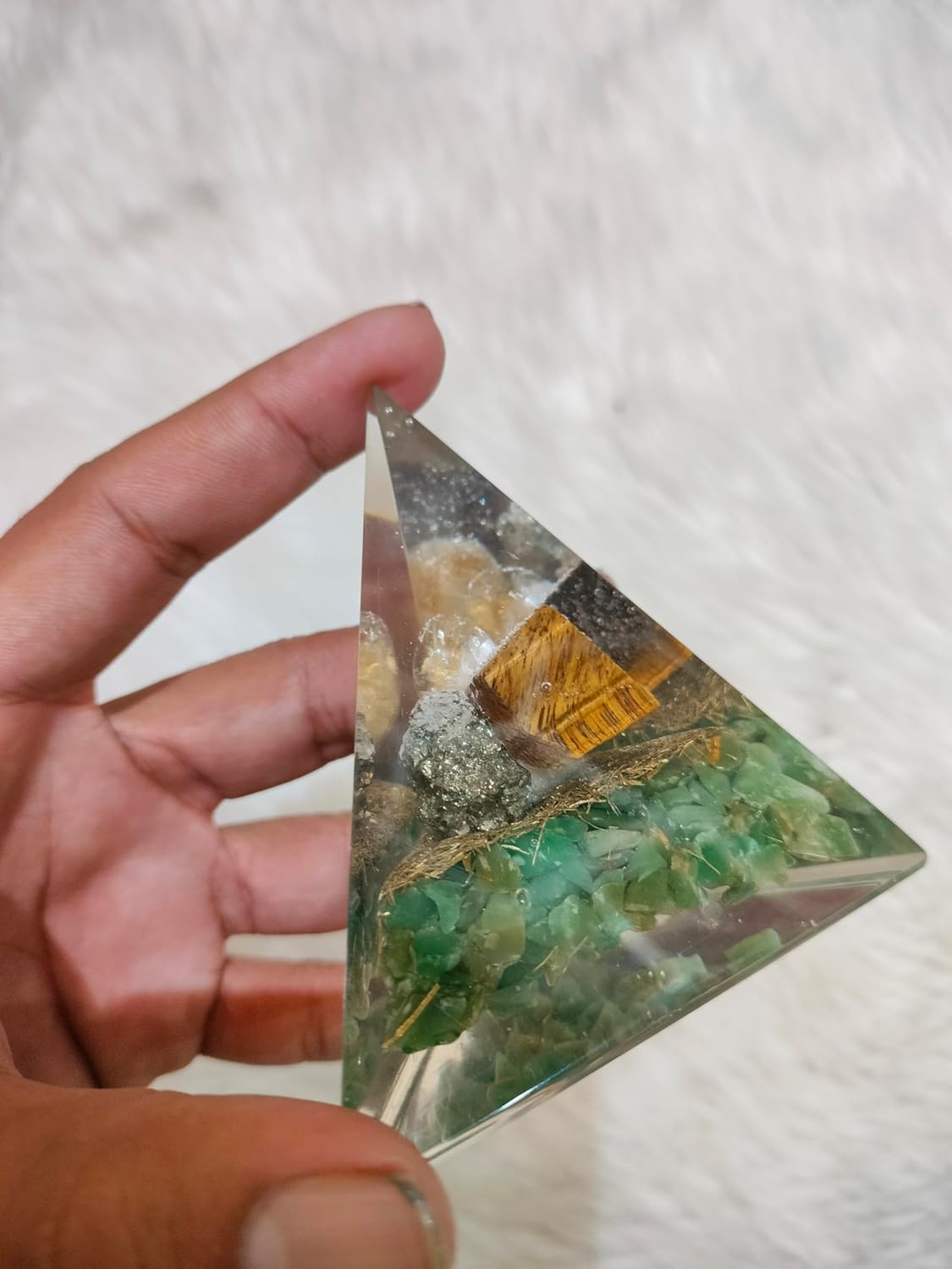 Unlock abundance, prosperity, and positive energy with our Multicolor Crystal Orgone Pyramid. Infused with a powerful combination of wealth-attracting crystals like Pyrite, Citrine, Green Aventurine, and Tiger Eye, this pyramid acts as a money magnet, enhancing financial success and stability. Designed for healing, chakra balancing, and EMF protection, it also promotes emotional well-being and manifestation power. Ideal for home, office, or meditation spaces, this handcrafted orgone pyramid is perfect for anyone seeking prosperity and spiritual growth.