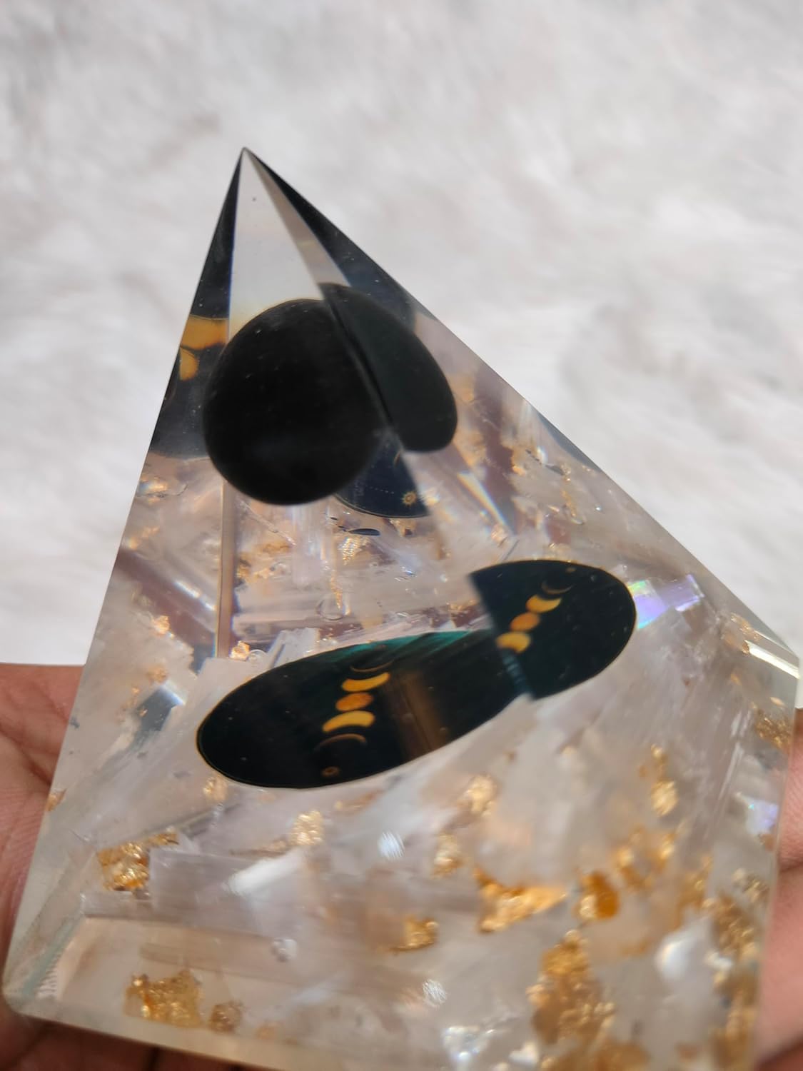 🌟 Black Sphere & Selenite Orgonite Pyramid – Protection & Energy Cleansing 🌟 This handmade Orgonite Pyramid is designed for ultimate energy protection, featuring a Black Sphere and Selenite Chips. It absorbs negative energy, shields against EMF radiation, and promotes emotional balance. Perfect for spiritual healing, meditation, and energy cleansing. 🔮 Key Features & Benefits: 🛡️ Black Sphere for Protection & Stability – A powerful crystal that blocks negativity and enhances inner strength. 💎 Selenite for Aura Cleansing – Known as the "Liquid Light" crystal, Selenite removes energy blockages and uplifts the spirit.