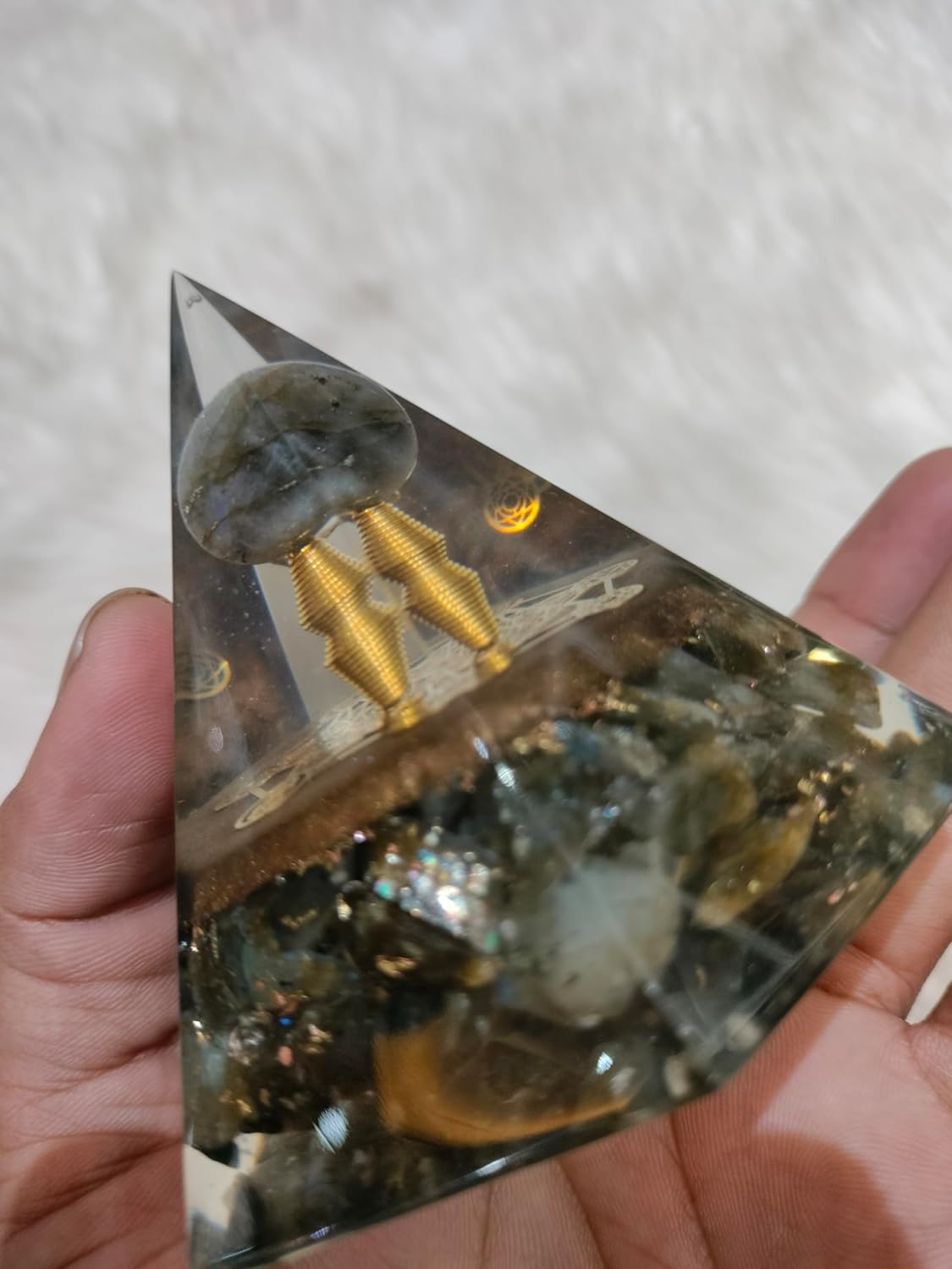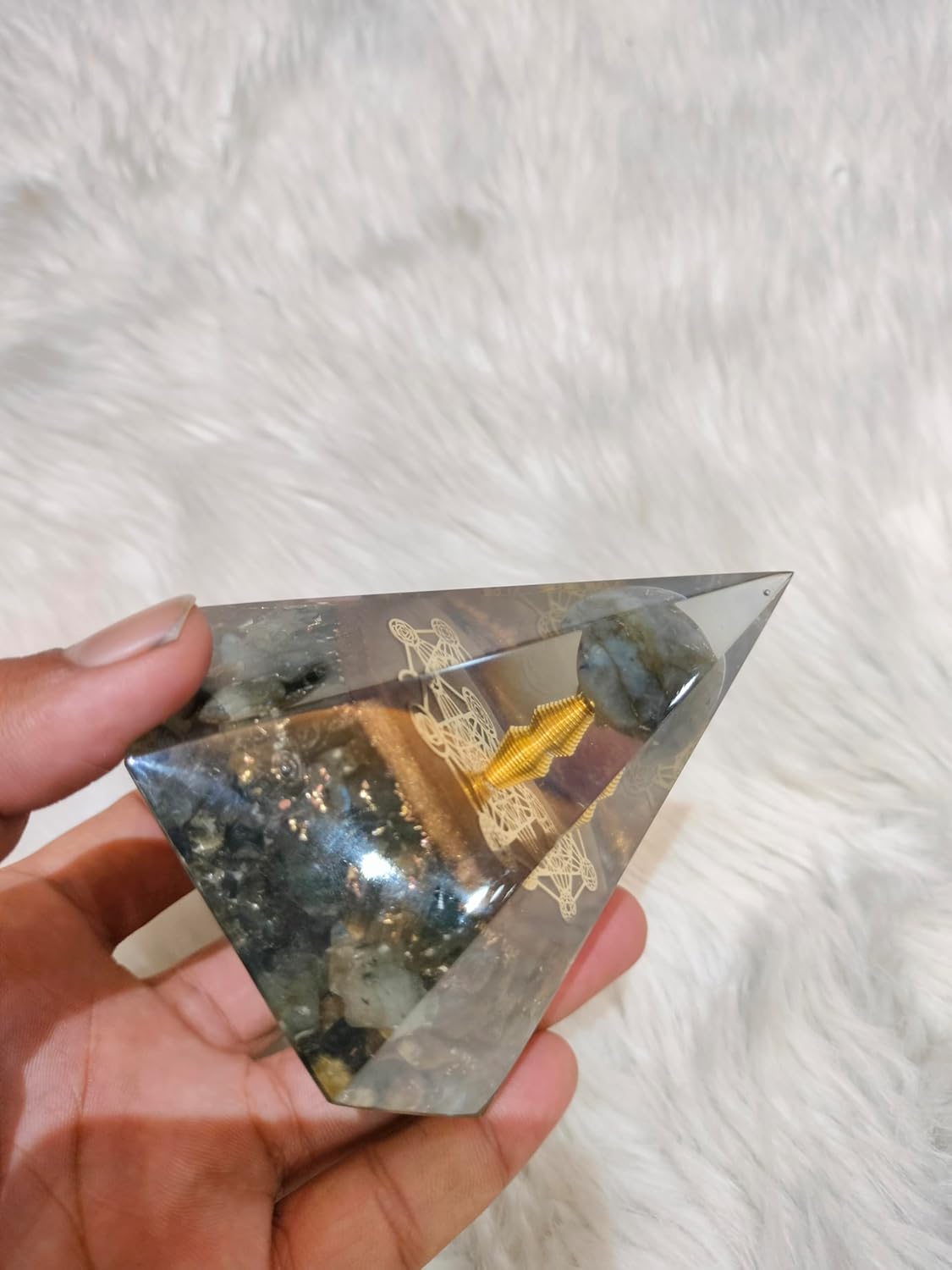Unlock the mystical power of Labradorite with this Nubian Cone Orgonite Pyramid, designed for protection, intuition, and energy transformation. Labradorite, known as the Stone of Magic, enhances spiritual awakening, intuition, and aura shielding. The Nubian cone shape amplifies energy flow, while Orgonite technology neutralizes EMF radiation and negative energies. Perfect for meditation, chakra balancing, and personal protection, this handcrafted pyramid is ideal for spiritual seekers, energy healers, and crystal enthusiasts.