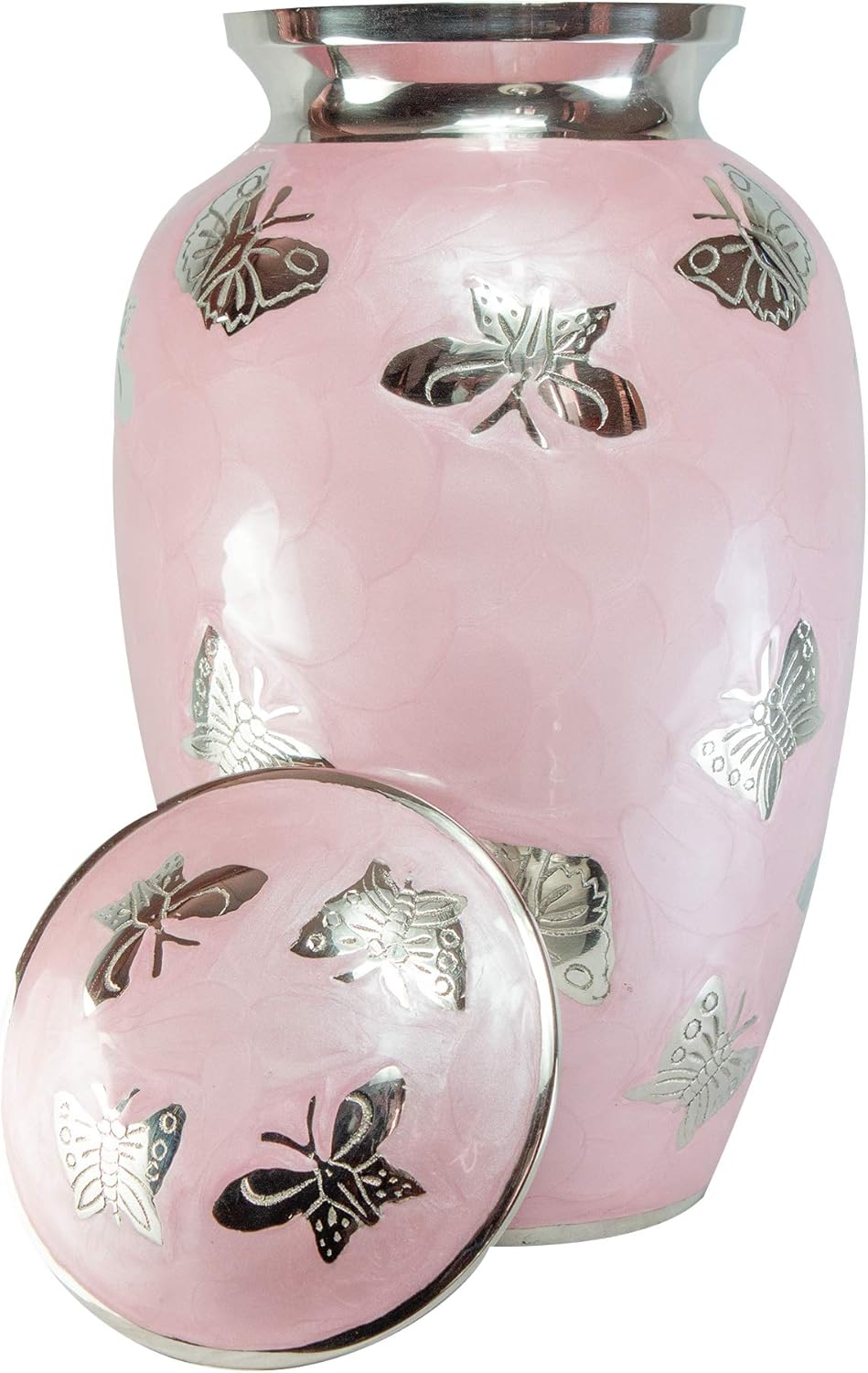 Proudly Honor Your Loved Ones: This adult size funeral cremation urn features hand engraved nickel finished butterflies against a lovely pink background to commemorate a loved one. Representing protection, purity, courage, love, harmony, happiness, hope, and faith, the pink color with intricately engraved butterfly design lend to a an eye-catching work of art for your home while serving as a beautiful resting place for your loved one. Handcrafted With Utmost Care and Quality: Our dedicated team of skilled artisans create our urns for ahses with superior craftsmanship and the highest-quality materials. Each urn is constructed of heavy- duty aluminum and meticulously hand-finished with details to respectfully commemorate your loved one. Dimensions: This cremation urn is approximately 10" H x 6.5" and can hold up to 210 pounds of body weight before cremation. Durable: Our cremation urns for human adult ashes are designed to stand the test of time with their best in class and durable construction. Each urn comes with a screw-on top lid and a felt lined base to protect your furnishings and require no maintenance. Commemorate Your Loved One with A Custom Engraved Tribute: As shown in the pictures the urn can be personalized to honor your loved one for no extra charge. You may choose the star of your liking. You may contact us if you want to customize it with an image of your own. We encourage you to thoroughly review the text for engraving carefully before adding the item to cart. We engrave the exact information we receive with the order and do not make any changes at our end.