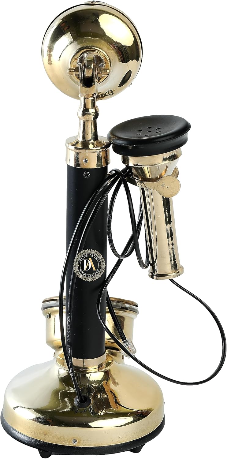 Add a touch of vintage elegance to your decor with this Handmade Antique-Style Candlestick Telephone Replica. Designed with a sleek black finish, brass accents, and a classic rotary dial appearance, this decorative piece is a stunning reproduction of the early 20th-century telephone style. Perfect as a showpiece for home, office, or themed events, it combines retro aesthetics with modern craftsmanship to create a standout display item