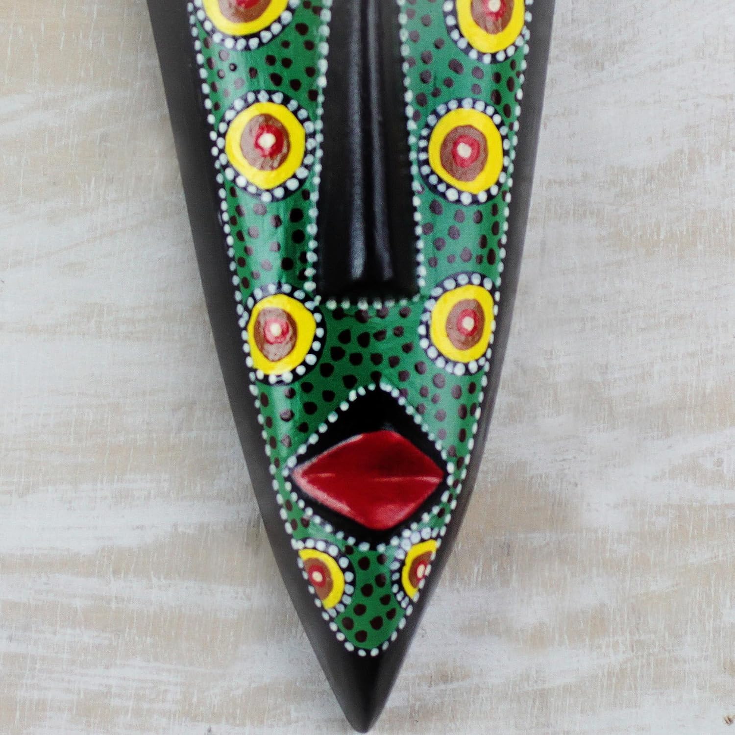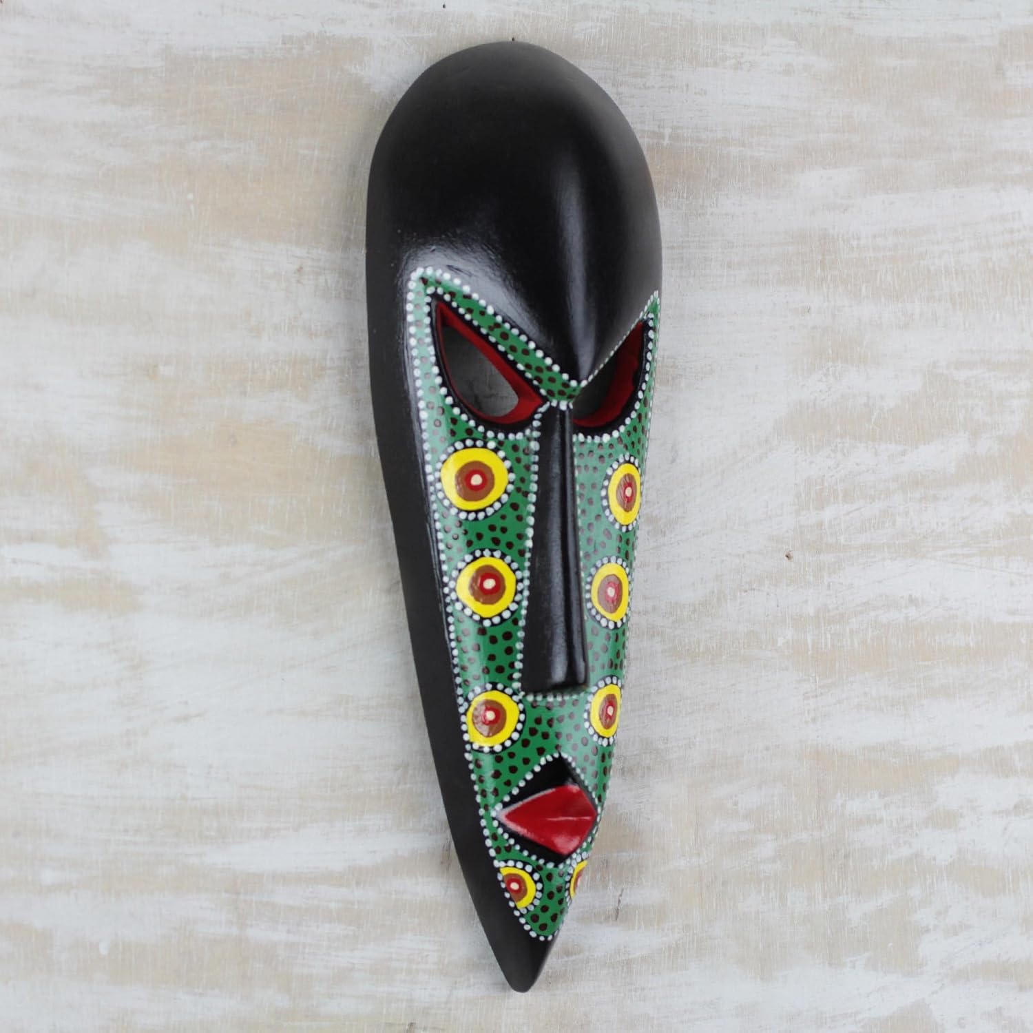 Ghanaian artisan K. Baka hand-carves this African mask of sese wood in a long shape with a pointed chin. He hand-paints the black mask in green with multicolored designs for a striking addition to your home decor.