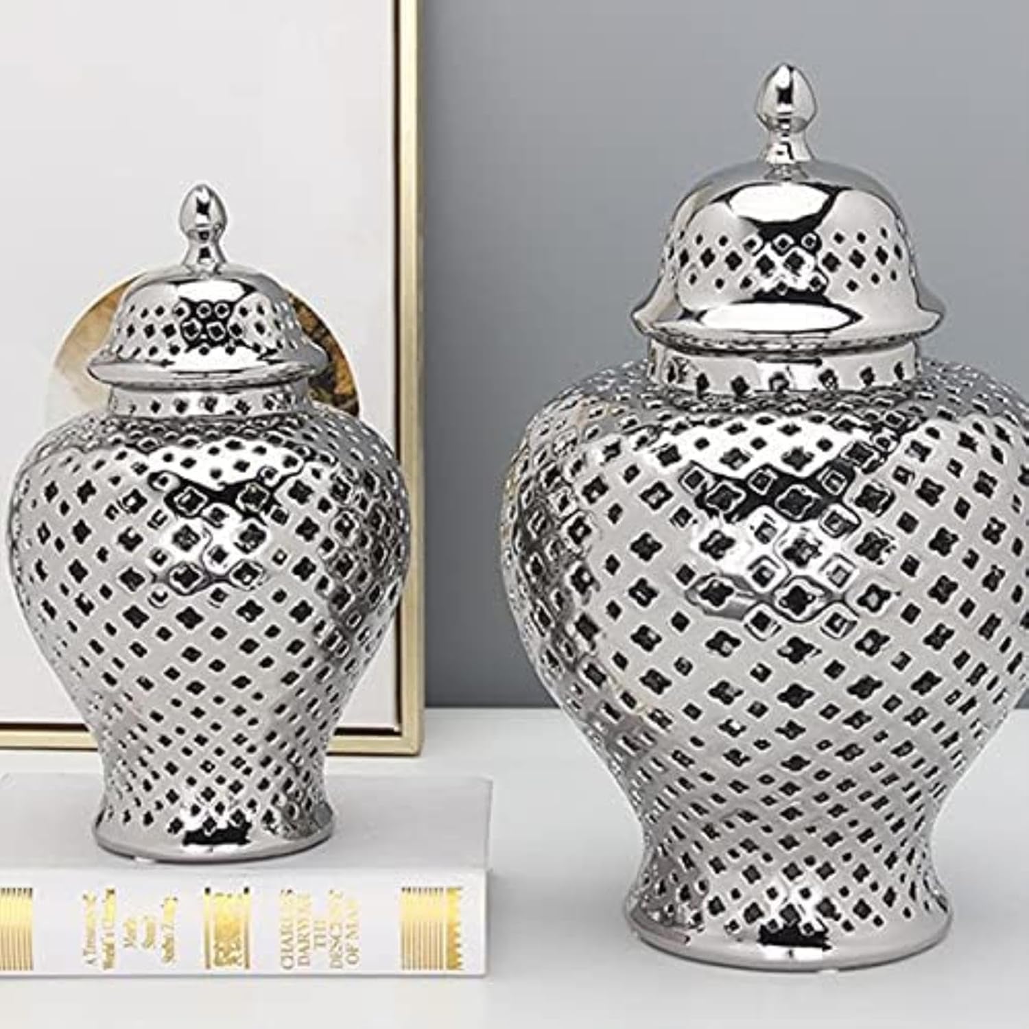 Striking pierced open lattice design lidded spice in a fine clear hard gloss finish. Displayed singularly or in pairs, this home decor accent is perfect for traditional or modern interior designs.Product Name: Storage ContainersMaterial: CeramicColor :SilverContainer Features: Moisture, health, environmental protectionpacking list:1x vase ContainerTips:1.There will be some errors in manual measurement, please understand2.Regarding maintenance: ceramic products should be kept away from sharp objects to prevent scratches.