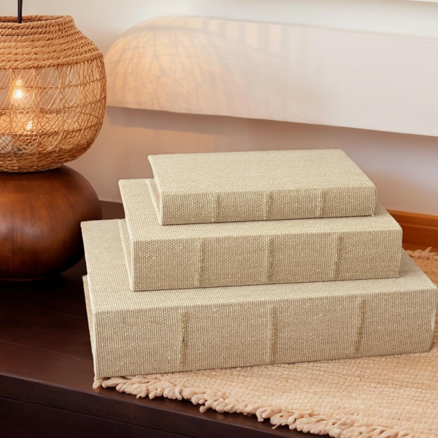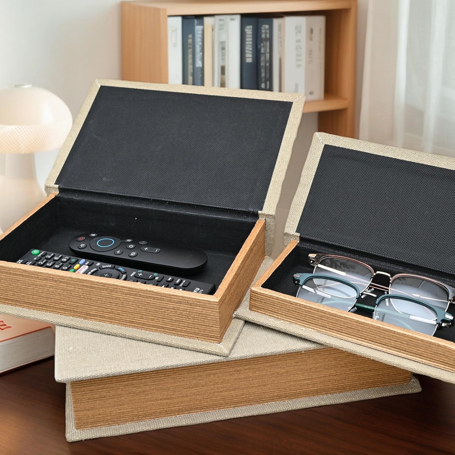 Transform your space with this Set of 3 Linen Decorative Book Boxes, designed to bring warmth, texture, and function into any room. Made from high-quality linen fabric in a neutral beige tone, each box mimics the look of a real hardcover book, adding sophistication to your shelves or tables. Inside, each faux book reveals a hidden storage compartment lined with a smooth black interior—perfect for storing remotes, jewelry, glasses, photos, or personal notes discreetly. With three graduated sizes, they can be stacked, displayed side-by-side, or arranged creatively to enhance visual layers in your decor. Whether placed on a coffee table, office desk, bookshelf, or bedside, these linen book boxes balance minimalism and warmth, fitting effortlessly into Scandinavian, farmhouse, or modern decor. A functional yet stylish solution for those who appreciate both design and order.