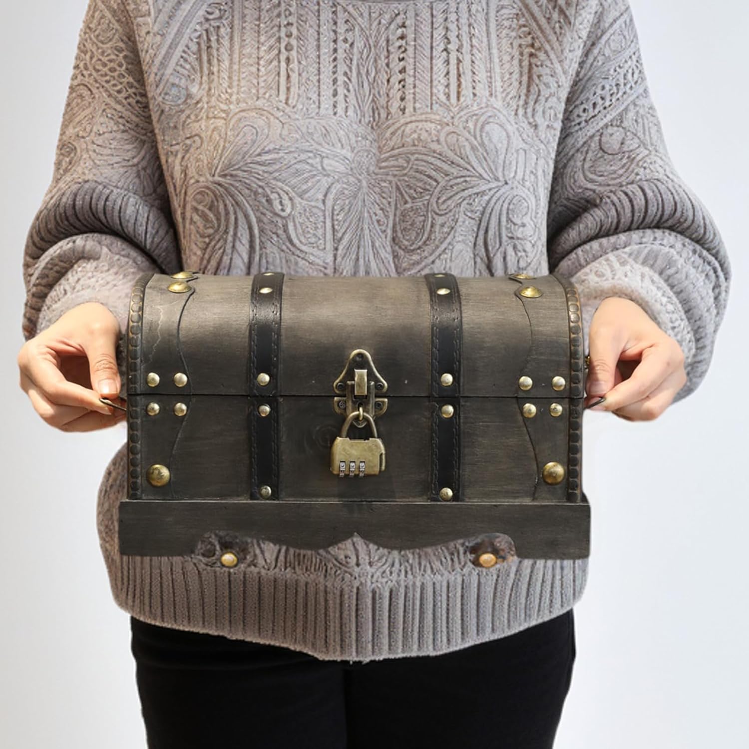 Bring a touch of timeless elegance to your home with this Vintage Wooden Treasure Chest. Measuring 12.2 x 7.1 x 7.1 inches, it’s the perfect blend of decorative style and functional storage. Crafted from solid wood with antique brass fittings and faux leather straps, it resembles an old pirate’s chest — making it both a nostalgic accent and a practical organizer. This box is ideal for storing jewelry, watches, small accessories, or keepsakes. The included 3-digit combination lock provides privacy and security, while the smooth hinges and curved lid add to its refined craftsmanship. Place it in your living room, study, or bedroom as a striking decorative piece, or use it as a gift box for someone special. Every detail — from the scalloped base to the vintage texture — reflects care, quality, and character.