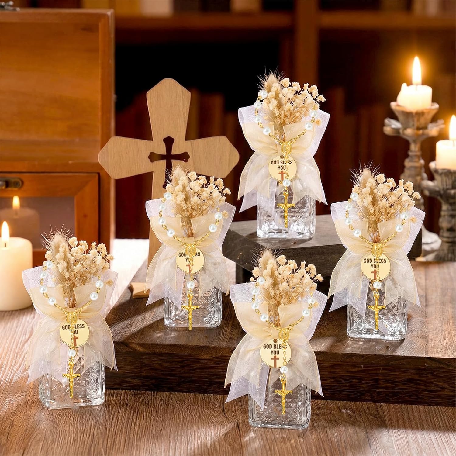 Features: Create beautiful holy water bottles with our complete set. Each baptism holy water bottle is pre-packed with faux flowers, a "God Bless" acrylic tag, and a bow. The included organza bag makes it easy to present these holy water bottles Catholic bulk as gifts or event souvenirs. Use these holy water bottles as special baptism party favors or everyday holy water containers. The set provides everything needed for crafting or gifting—glass bottles, cross bracelets, organza bags, and decorative pieces. Each bottle for holy water is designed for simplicity and repeated use. Specifications: Bottle material: glass Color: gold and clear Bottle size: about 4.33 x 1.77 inches Package includes: 24 x Holy water bottle 24 x Acrylic piece 24 x Bow 24 x Dry flower 24 x Organza bag 24 x Gold cross bracelet Notes: Manual measurement, please allow slight errors on size. The color may exist a slight difference due to different screen displays