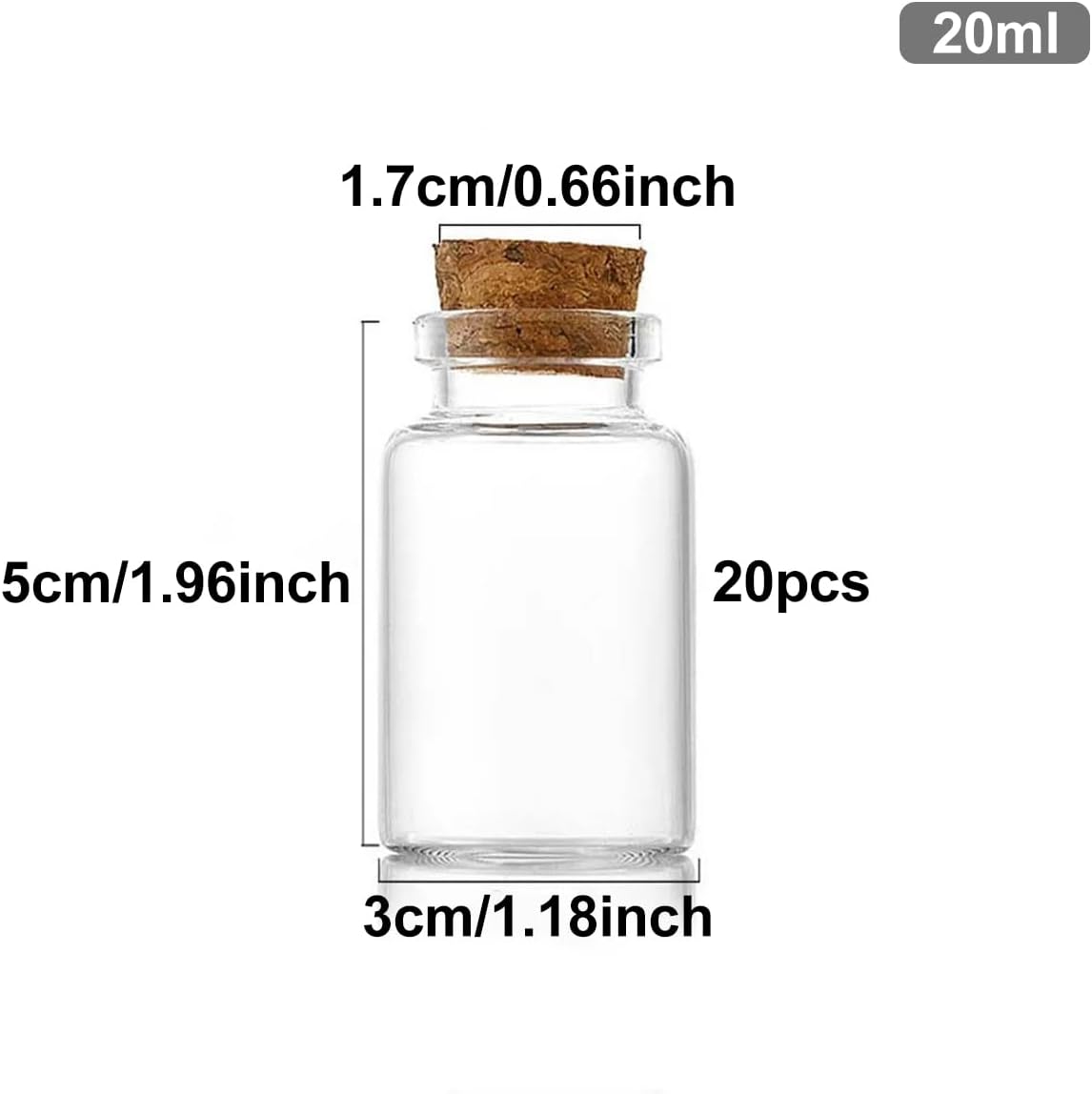 Application: Transparent small glass bottles with cork stoppers can be used for dispensing, packaging or storing liquids and solids, and are very suitable as sample bottles, and liquid containers. Small glass vials with cork lids are perfect for storing powders, spices, perfumes, glitter, sequins, small jewelry, specimens, and a variety of small items. The clear glass bottles are exquisite and compact, and the transparent bottle body can show the contents, which is very suitable for DIY message bottles, miniature artworks, craft decorations and party gifts. Specification: Material: Glass Color: Clear Quantity: 20 Pcs Package Includes: 20 x Small Glass Bottles with Cork Stoppers Notice: 1. Size Based on different measurement methods, there will be a slight deviation. 2. Due to the light and screen difference, the item's color may be slightly different from the pictures, thanks for understanding.