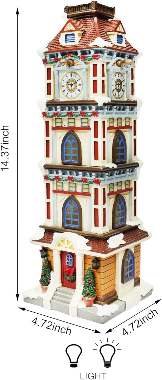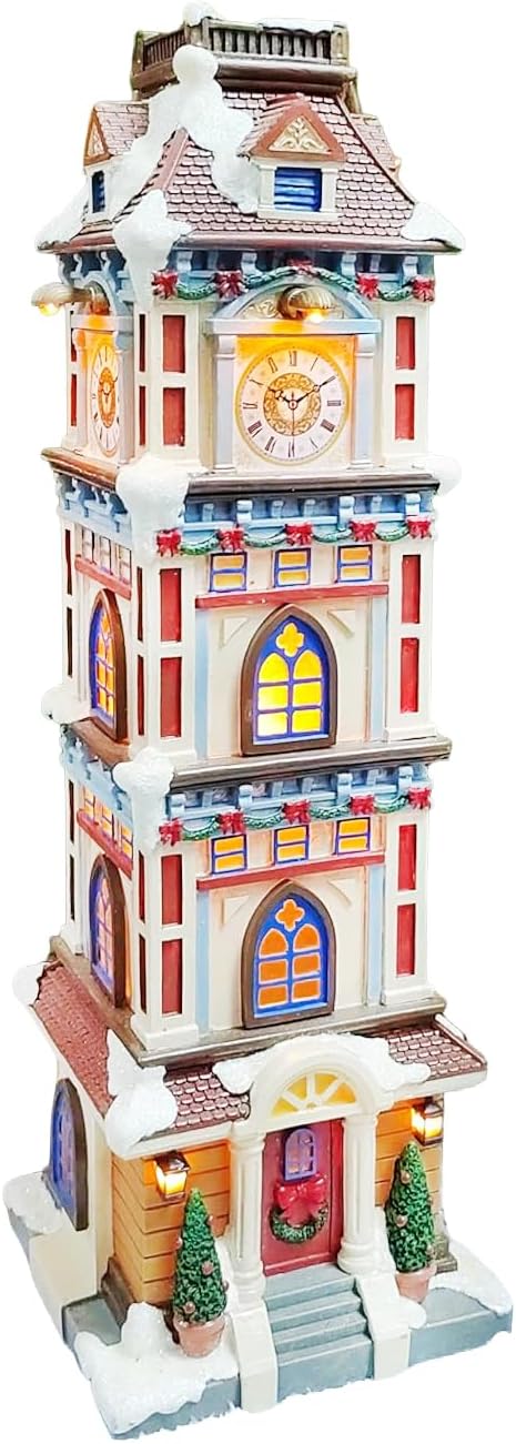 Elevate your Christmas village display with the Moments in Time 14.5” LED Lighted Clock Tower, a stunning holiday piece that captures the grandeur of vintage European architecture and the warmth of festive nostalgia. Standing tall at 14.37 inches, this magnificent four-story clock tower combines intricate design with the cozy glow of LED lighting, creating a show-stopping centerpiece for your holiday décor. The cream-colored façade, adorned with snow-dusted accents and festive garlands, evokes the charm of a winter wonderland. The base of the tower features a deep red front door, elegantly framed by two potted evergreens decorated with red ornaments and glowing lamps. Above, arched windows radiate a welcoming amber light, bringing life to every floor. The structure culminates in a beautifully detailed Roman numeral clock face, surrounded by architectural moldings and snow-covered eaves a timeless symbol of the season’s passage and joy. Crafted from high-quality, hand-painted polyresin, every inch of this collectible exudes care and craftsmanship. Whether placed in your Christmas village, on a mantel, or as a standalone decorative accent, it creates an atmosphere of warmth and wonder. The battery-operated design (3 AA batteries, not included) allows cordless convenience, letting you showcase it anywhere in your home. No outlets, no hassle just beautiful light and Christmas magic wherever you want it. This exquisite piece also comes in Moments in Time’s signature gift packaging, making it a perfect present for anyone who loves timeless Christmas décor. It’s ready to gift straight out of the box, no wrapping required. Dimensions: 4.72” L x 4.72” W x 14.37” H Weight: 2.2 lbs Material: Hand-Painted Polyresin Power: 3 AA Batteries (Not Included) Features: LED Lights, Snow Accents, Gift-Ready Packaging Bring home the Moments in Time LED Lighted Clock Tower where artistry meets holiday elegance, creating a lasting impression in your Christmas collection.