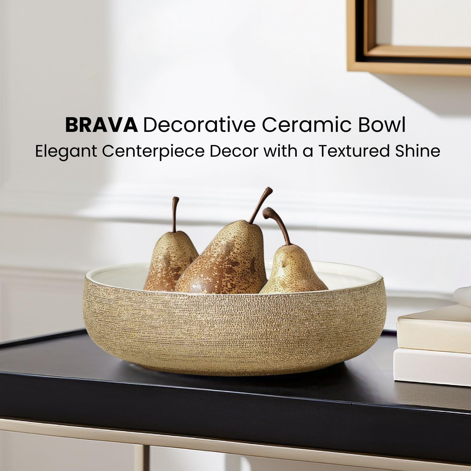 Elevate your home decor with the Brava Round Ceramic Decorative Bowl, a versatile and elegant piece measuring 10x10x3 inches. Featuring a luxurious textured reflective gold exterior and a high-gloss optic white interior, this handmade bowl is perfect for displaying fruit, holding pillar or floating candles, or serving as a stylish catch-all in your entryway. Its electroplated non-tarnishing finish ensures long-lasting beauty, making the Brava bowl a timeless addition to any space.