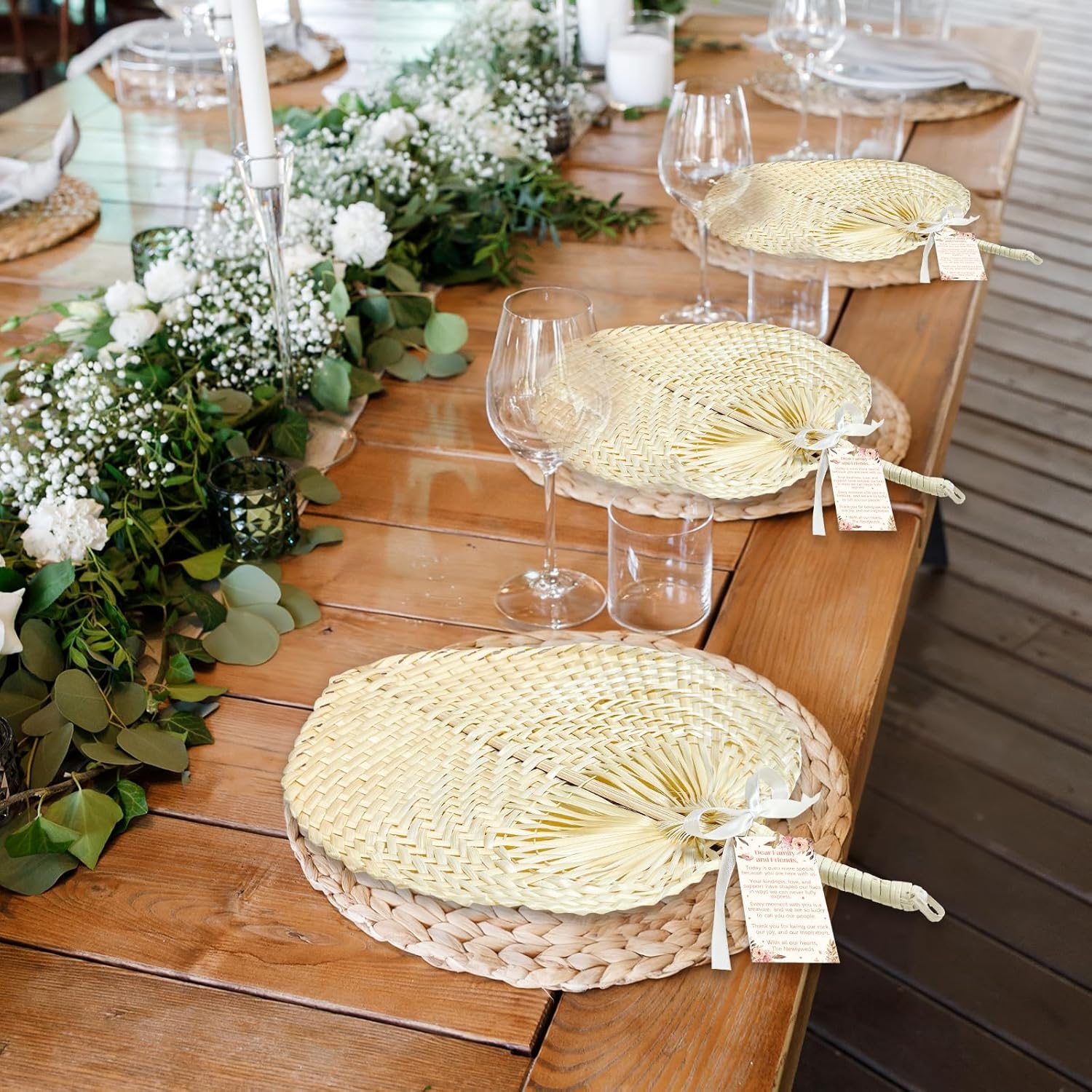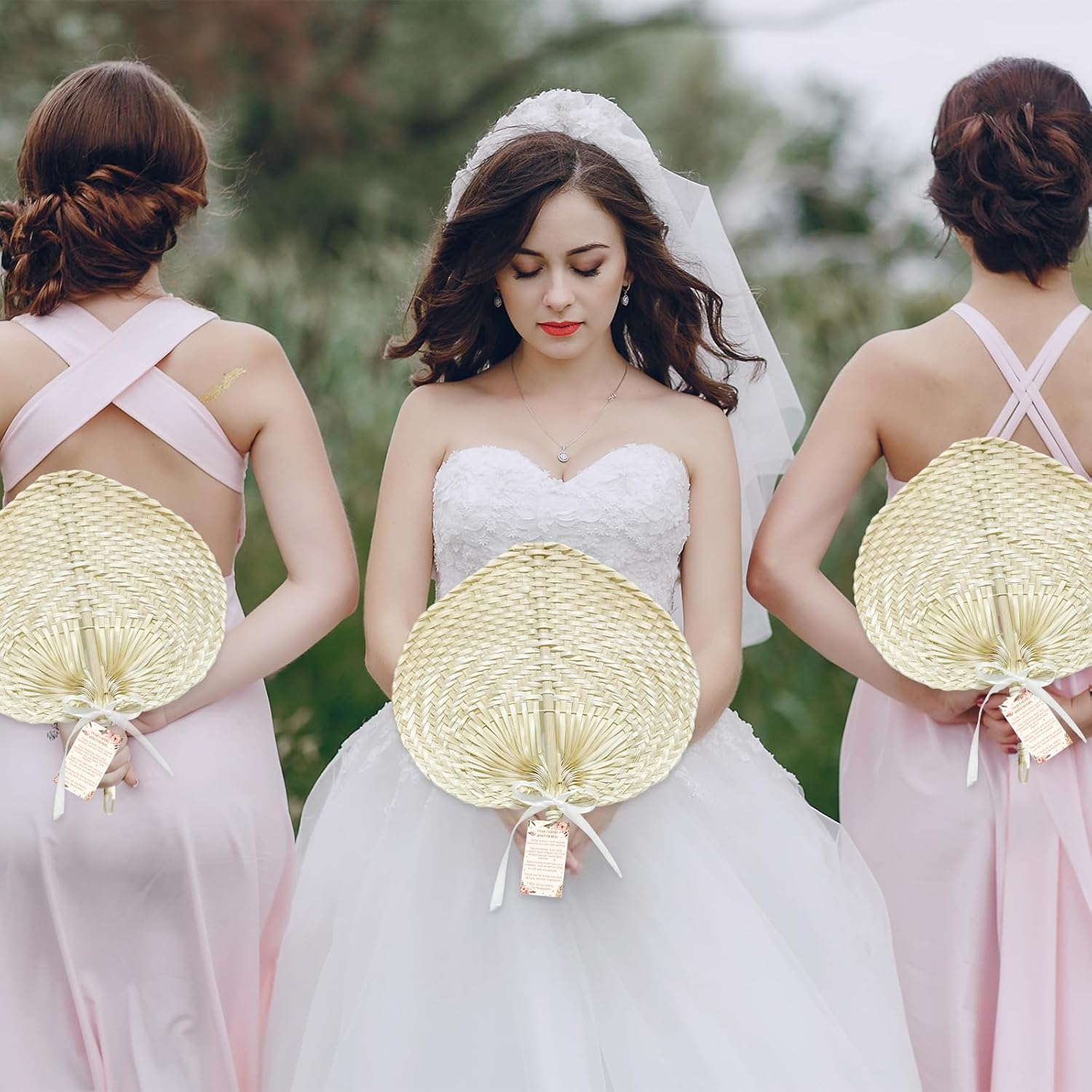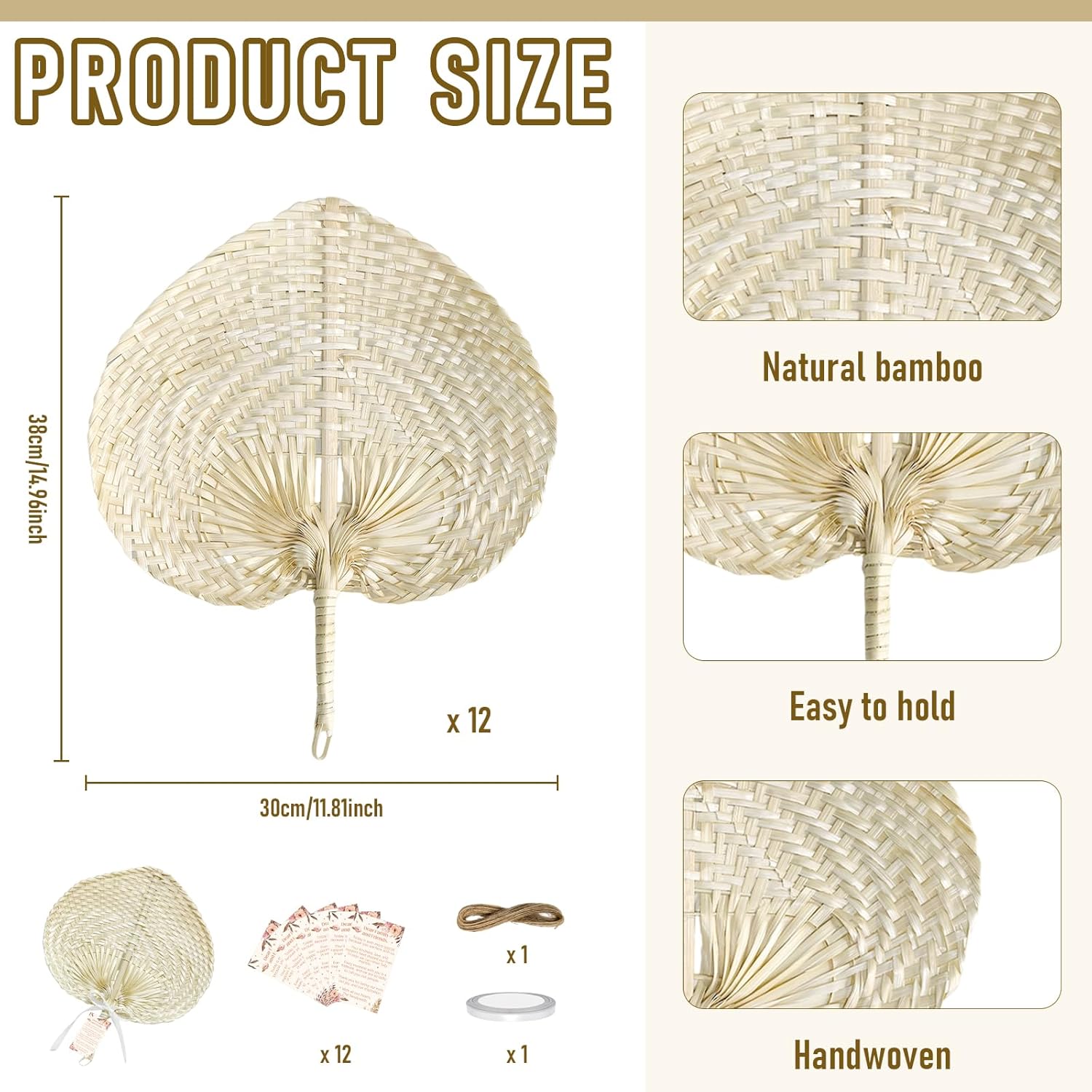 Elegant Gift Set: Bring elegance, comfort, and charm to your special day with the Handmade Bamboo Wedding Fan Set — a thoughtful and stylish way to thank your guests and keep them cool during your ceremony. Specifications: Main material: raffia palm leaf fiber Color: natural color Size: 15 x 11.8 inches Package includes: 12x handcrafted fans 12x thank-you cards 1x rustic jute twine 1x satin ribbon Note: There may be slight differences in color due to different screens. Please allow slight errors in size for manual measurement.