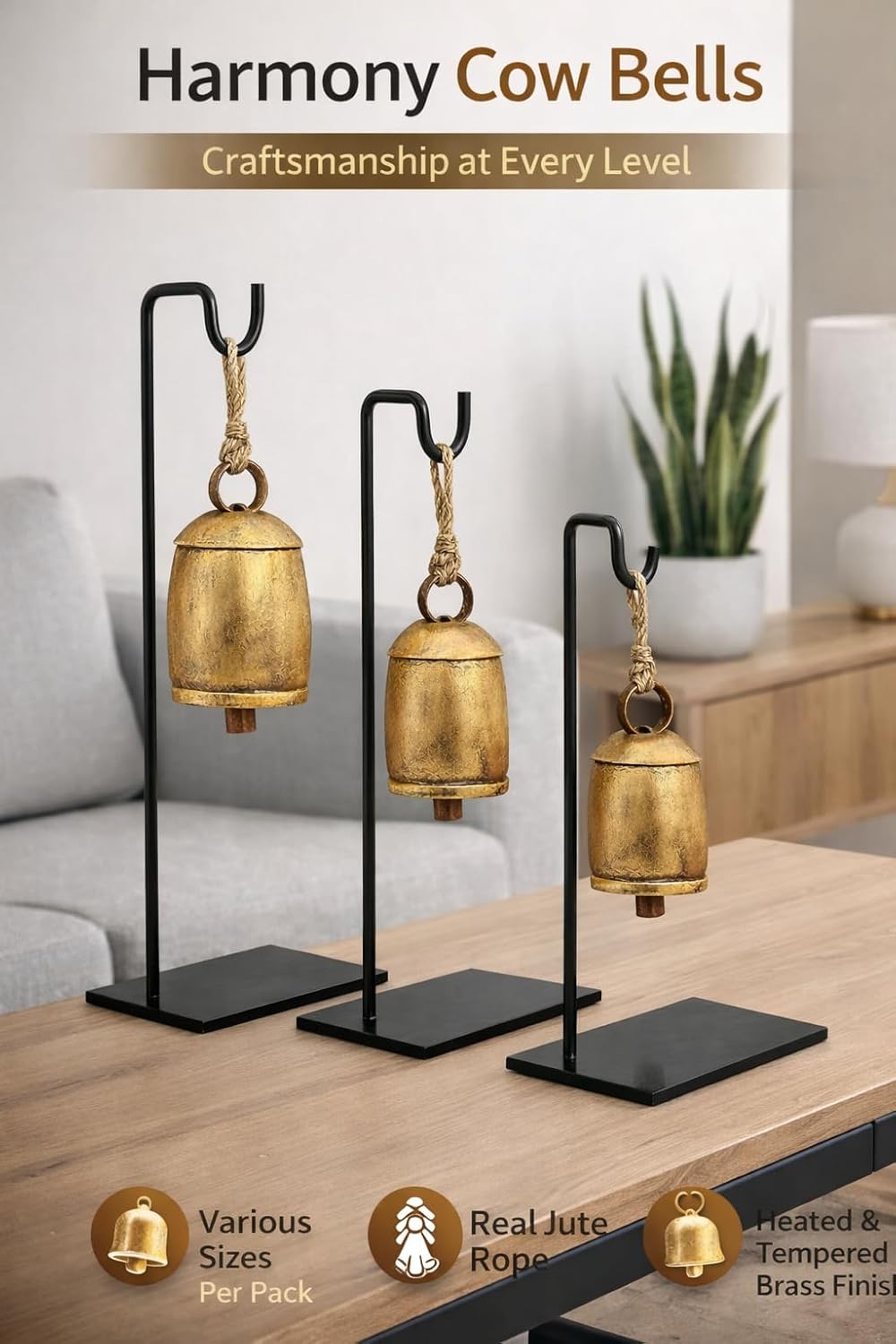 Bring timeless rustic charm to your space with this Set of 3 Golden Brass Bells with a Black Iron Base. Carefully handcrafted and kiln-treated, these bells feature a beautifully aged finish that reflects traditional metalworking techniques. Their rich, vintage look pairs perfectly with farmhouse, country, or festive décor themes. Whether hung indoors or outdoors, these bells not only serve as decorative accents but also produce a clear, resonant sound when moved together. Perfect for Christmas décor, garden styling, balconies, or as a unique statement piece for your home, this bell set adds both visual appeal and authentic craftsmanship to any setting.