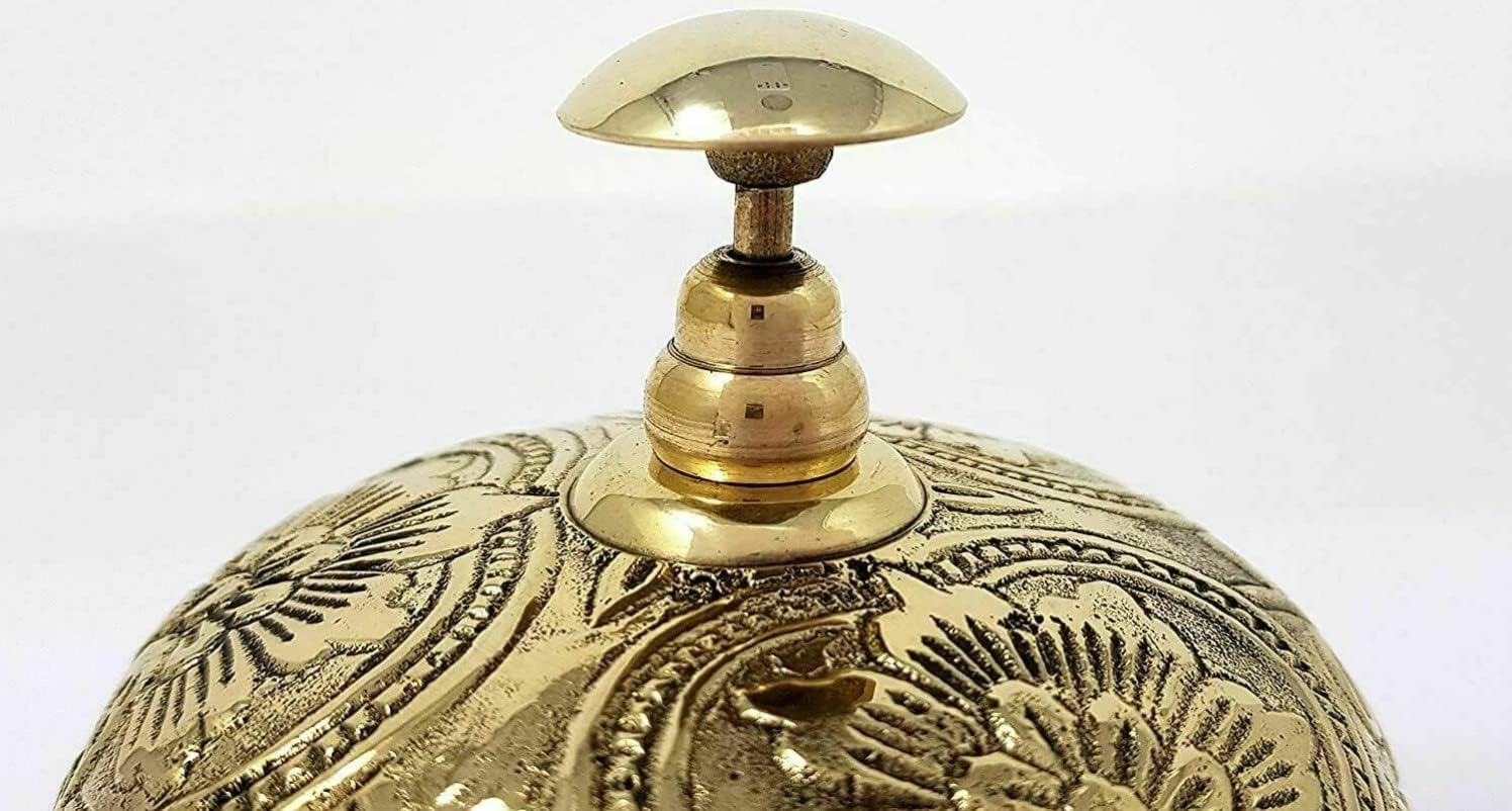 Add a touch of Victorian elegance to your establishment with this exquisitely crafted service bell. The ornate solid brass construction features intricate floral patterns on both the dome and the decorative base, creating a stunning vintage aesthetic. The bell produces a clear, resonant ring that commands attention without being overly intrusive. Perfect for hotels, restaurants, schools, reception areas, hospitals, and warehouses, this functional piece of art combines practicality with sophisticated design. The detailed craftsmanship includes a beautifully embossed dome top with classic flower motifs, while the base showcases elaborate openwork patterns characteristic of Victorian-era metalwork. The sturdy construction ensures long-lasting performance, while its compact size makes it an ideal addition to any counter or desk space. This bell serves as both a practical signaling device and a distinguished decorative accent that elevates the ambiance of any professional setting.