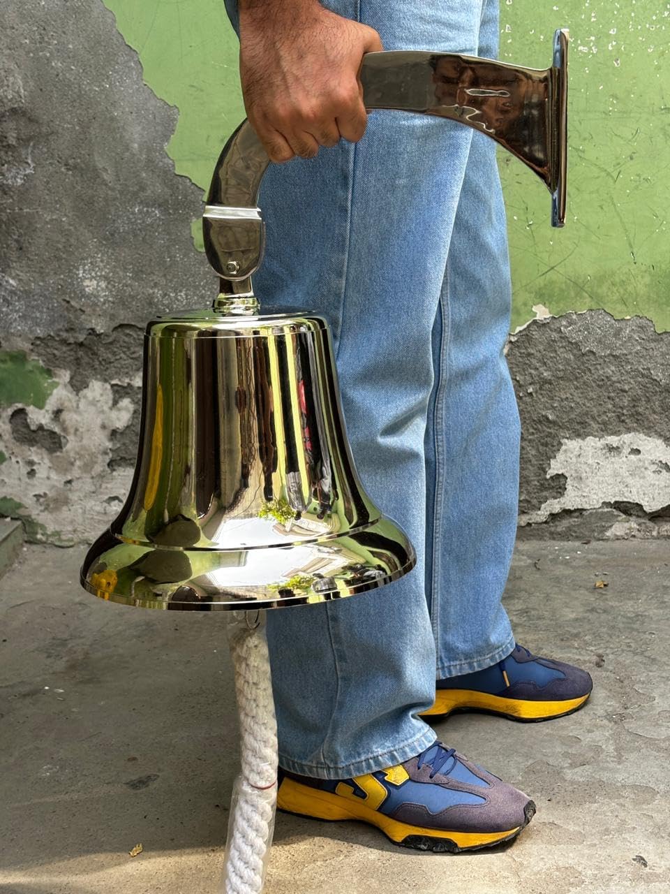 18 Inch Nautical Brass Ship Bell with Wall Mount Bracket – Nickel Finish Marine Bell, Large Decorative Hanging Bell with Rope Handle for Home, Office, Garden & Boat Decor (12 Inch Diameter)