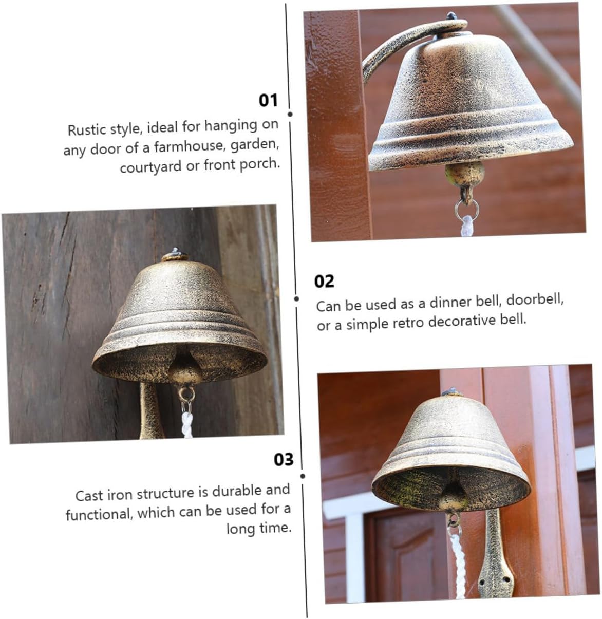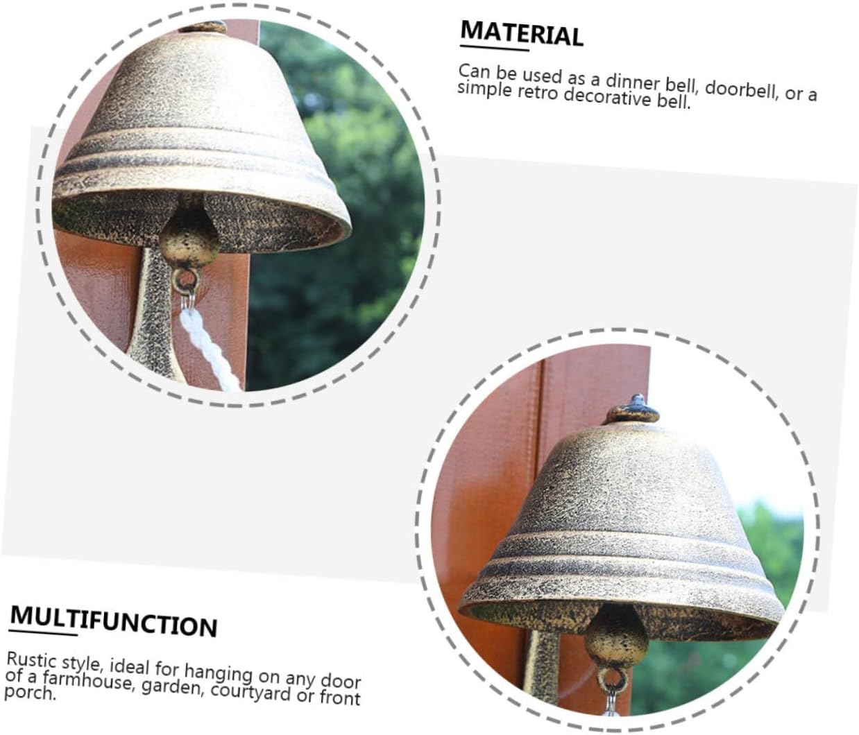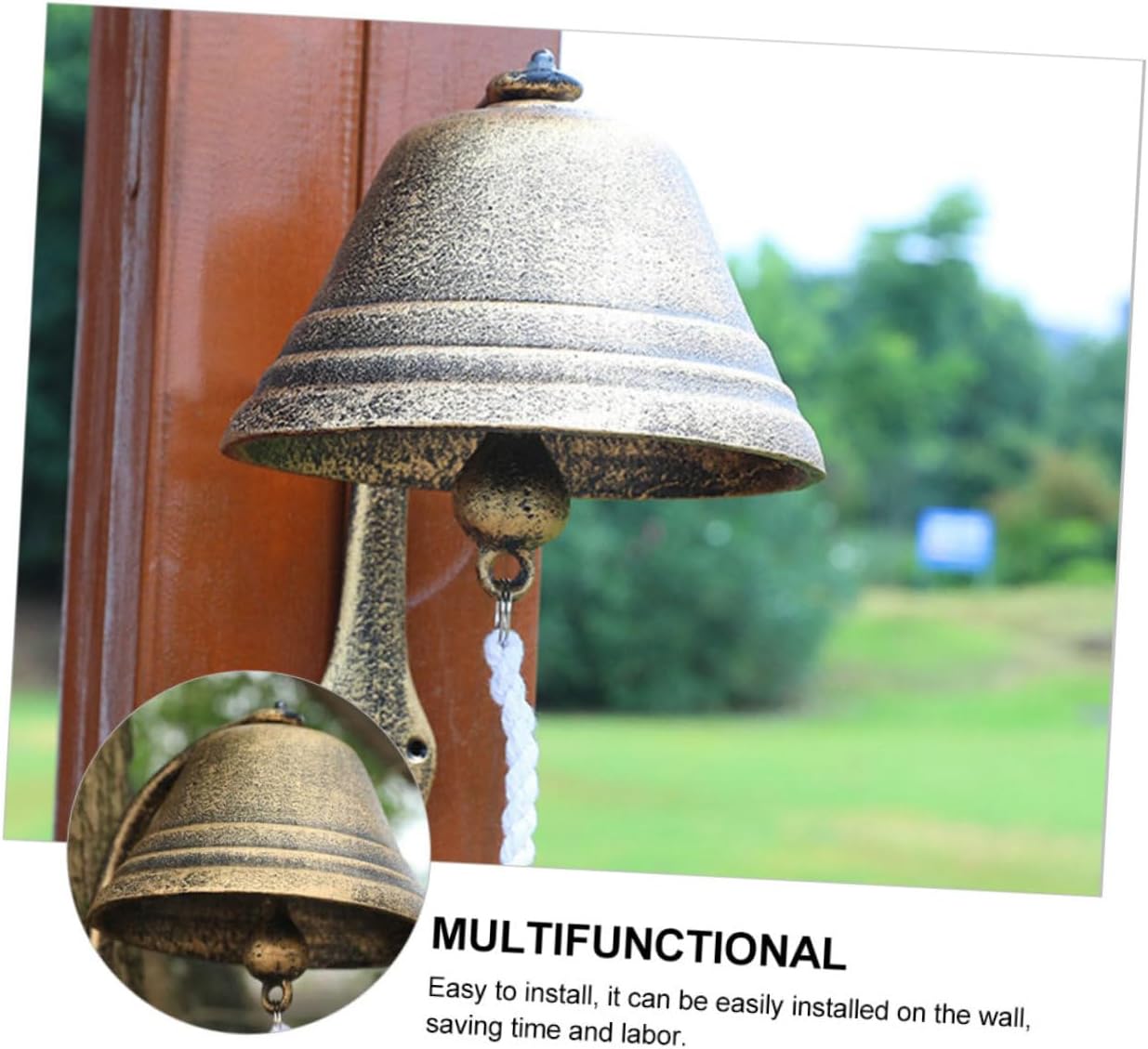Package List 1 x Cast Iron Doorbell Features - Size: Approx. 24.00X17.50X17.50cm/9.43X6.88X6.88in. - Material: Cast iron, cotton rope. - Color: Assorted Color. -Product Info:Retro doorbell decoration - The shaking rope is made of cotton material, which is comfortable to use. - The size is moderate, which can be used installed on the wall, door or desk. - Vintage and delicate, suitable for most home decoration style Welcome Door Decor. - Multi-functional and versatile, can be used as a dinner bell, a doorbell, a school bell, an opening hand shaking bell, etc Cast Iron Wall Bell. - and vintage, better decorate your courtyard Holiday Scene Decor.Goods InformationWelcome Door Decor The ringtone is crisp, please to use it.Dinner Bell This product is a hand shaking bell, which is and rustless.Antique Style Doorbell Anti-rust treatment on the retro surface.Hand Cranking Bell The surface is in a rough retro style, full of chunky feel