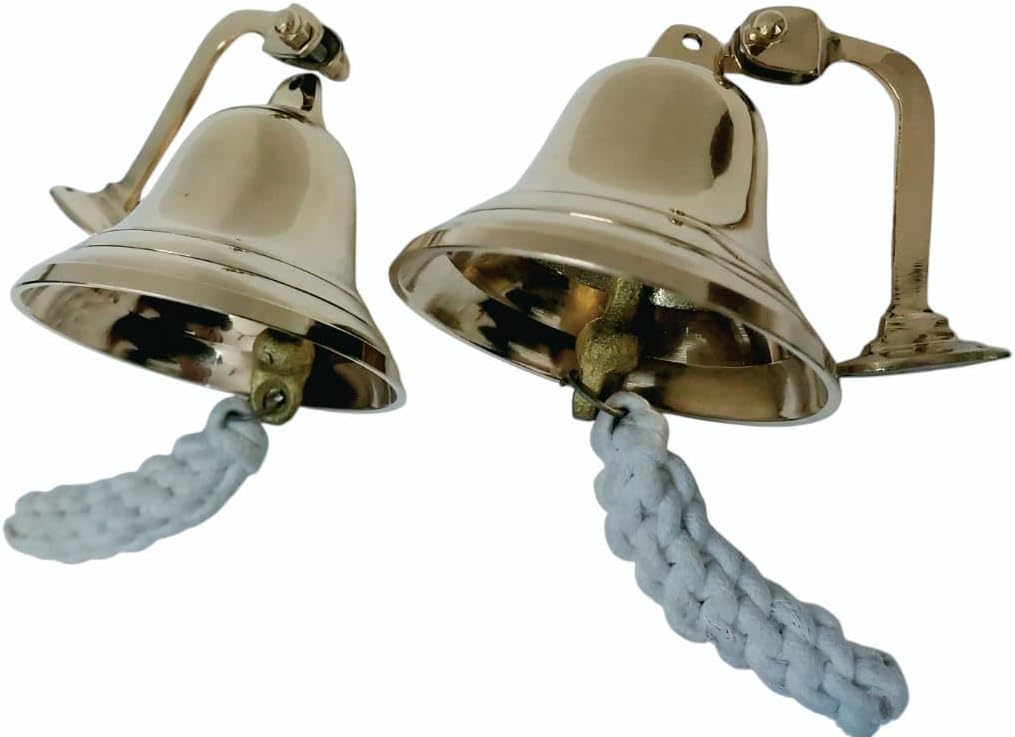 Add a touch of maritime charm to your home with this exquisite set of two solid brass ship bells. Each bell features a polished gold finish that gleams with sophistication, making them perfect as both functional pieces and decorative accents. The bells come complete with sturdy wall mounts for easy installation and classic white rope pulls that add to their nautical appeal. The traditional design includes a curved mounting bracket that positions the bell at the ideal angle for ringing. These substantial brass bells produce a clear, resonant tone that can be heard throughout your space. Whether mounted in an entryway, on a patio, or as part of your nautical-themed decor, these bells serve as both beautiful ornaments and practical signaling devices. The durable brass construction ensures lasting beauty while developing a distinguished patina over time. The included mounting hardware makes installation straightforward, allowing you to easily add these distinctive pieces to your home's decor.