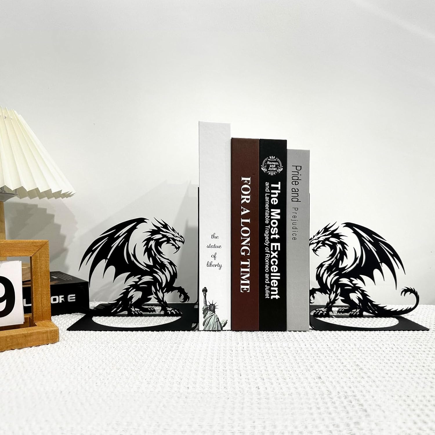 Metal Dragon Bookends, Dragon Bookends for Shelves, Western Book Ends, Bookshelf Decor Fantasy, Book Stopper, Book Ends Decorative, Black Book Holders for Home Office Quality is at the heart of our bookends: The use of high-quality metal means that they are built to withstand the test of time. The metal is thick and sturdy, ensuring that they can support a large number of books without bending or breaking. The surface finish is smooth to the touch, with a protective coating that guards against scratches and fading. This not only keeps the fantasy bookends looking new but also makes them easy to clean. A simple wipe with a soft cloth is all it takes to maintain their luster. Functional Book Organizer: Beyond their stunning appearance, this dragon bookshelf decor serve a practical purpose. They are designed to neatly organize your books on a desk, bookshelf, or any flat surface. The sturdy base and the shape of the dragon's body provide excellent support, preventing books from toppling over. Keep your reading materials in order while adding a touch of fantasy to your workspace. Material:2mm steel - Quality Lightweight 14 Gauge Steel. Color:Black Western Book Ends Dimensions:13.8" x 5.9" x 0.07" Notes: 1. The color may exist slight differences due to different screen displays. 2. Please allow a 1-3% size difference according, due to the manual measurement, Please make sure you do not mind before you bid.