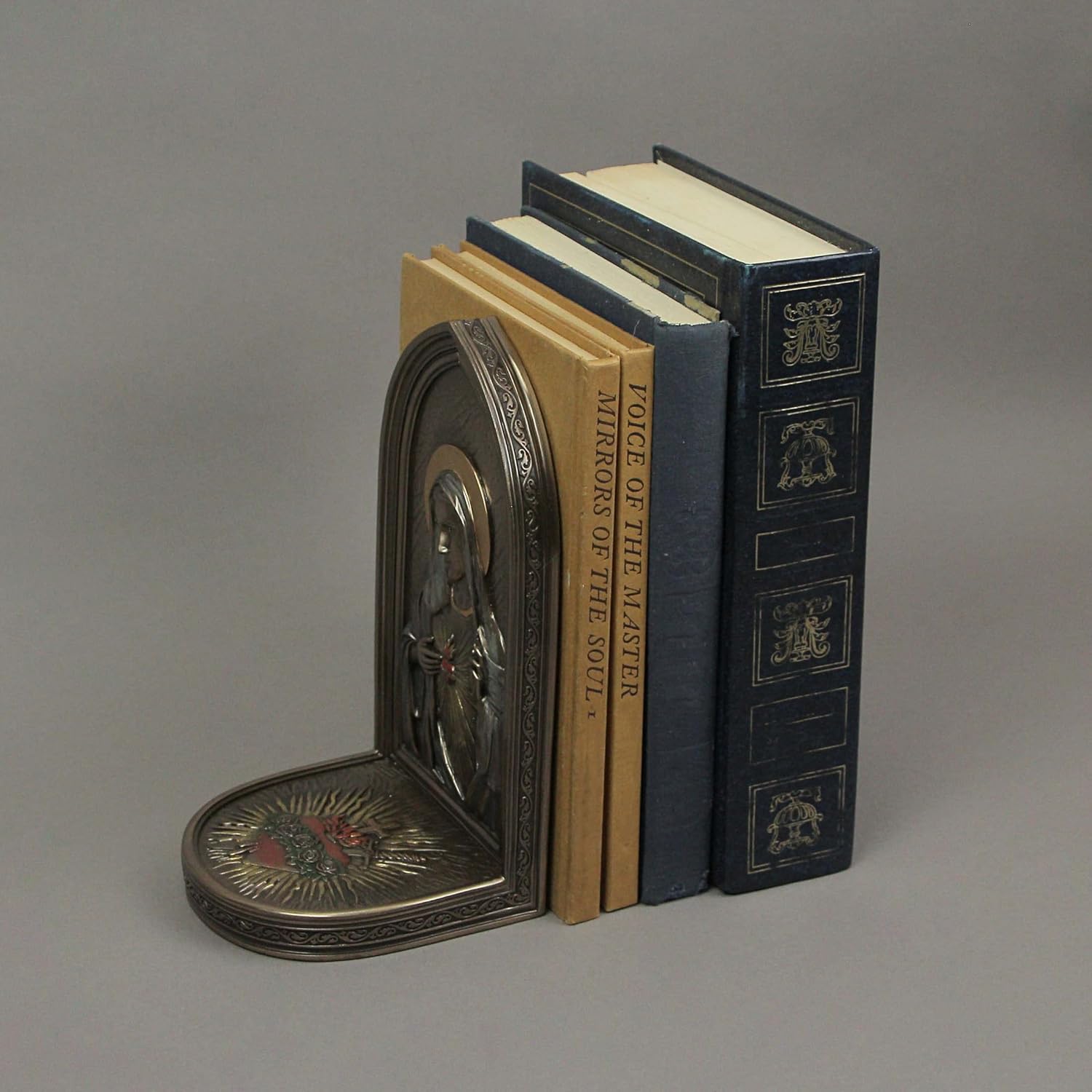 A standing plaque featuring the religious icon - The Immaculate Heart of Mary, the plaque can be used as a single bookend against the shelve