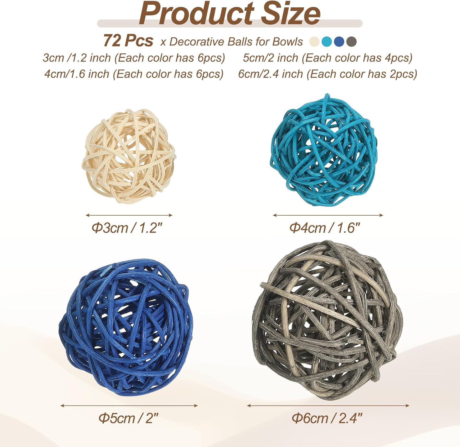 These wicker rattan balls add a natural, rustic charm to any space, perfect for table centerpieces, vase bowl filler, craft supplies, wedding, party, home decor, and event styling, a great atmosphere decor.SpecificationColor: Deep Blue/Blue/Gray/NaturalMaterial: RattanSize: 3cm /1.2 inch; 4cm/1.6 inch; 5cm/2 inch; 6cm/2.4 inchPacking List: 72 x Decorative Balls for Bowls (8 x 2.4" Balls, 16 x 2" Balls,24 x 1.6" Balls, 24 x 1.2"AdvantageOur handmade wicker decorative balls are meticulously crafted by experienced artisans. They are even dyeing, offering a simple yet durable design that is lightweight, compact, and reusable for a variety of occasions.InstructionHoliday Crafting Essentials: Elevate your DIY projects with our decorative balls for centerpieces, perfect for showing your creativity. Whether you are adorning your walls, stringing them with lights, or placing them in a clear vase, these balls will help you craft a cozy ambiance and infuse a touch of nature into your space.NOTE: Please note that our handmade wicker decorative balls may exhibit slight deviations in size, color, and shape.