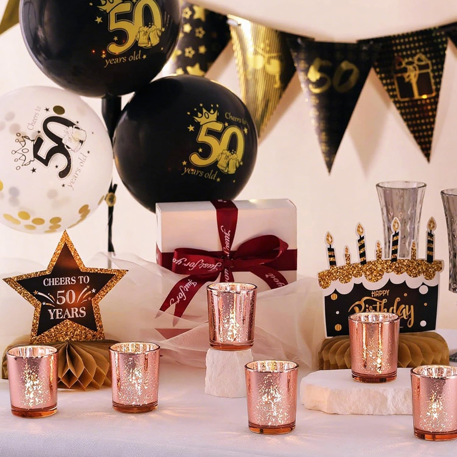 ROSE GOLD VOTIVE CANDLE HOLDERSQuantity: 6 pcsColor: Rose GoldMeterial: GlassDimension: 2.12"(bottom 1.85")*2.56"Just as a beautiful frame shows-off an exquisite painting, our gold votive candle holders transform votive candles into twinkling works of art. Creating a warm, welcoming atmosphere, in your home, begins with lighting a candle in the right candle holder. Our selection of candle holders will give your space a cosy glow. Bringing the vintage look into the design and fuse cold and warm materials for a unique expression is our mercury glass candle holders. Contain no harmful chemicals, small size and portable.NOTE: Wax tea light candles are not included.