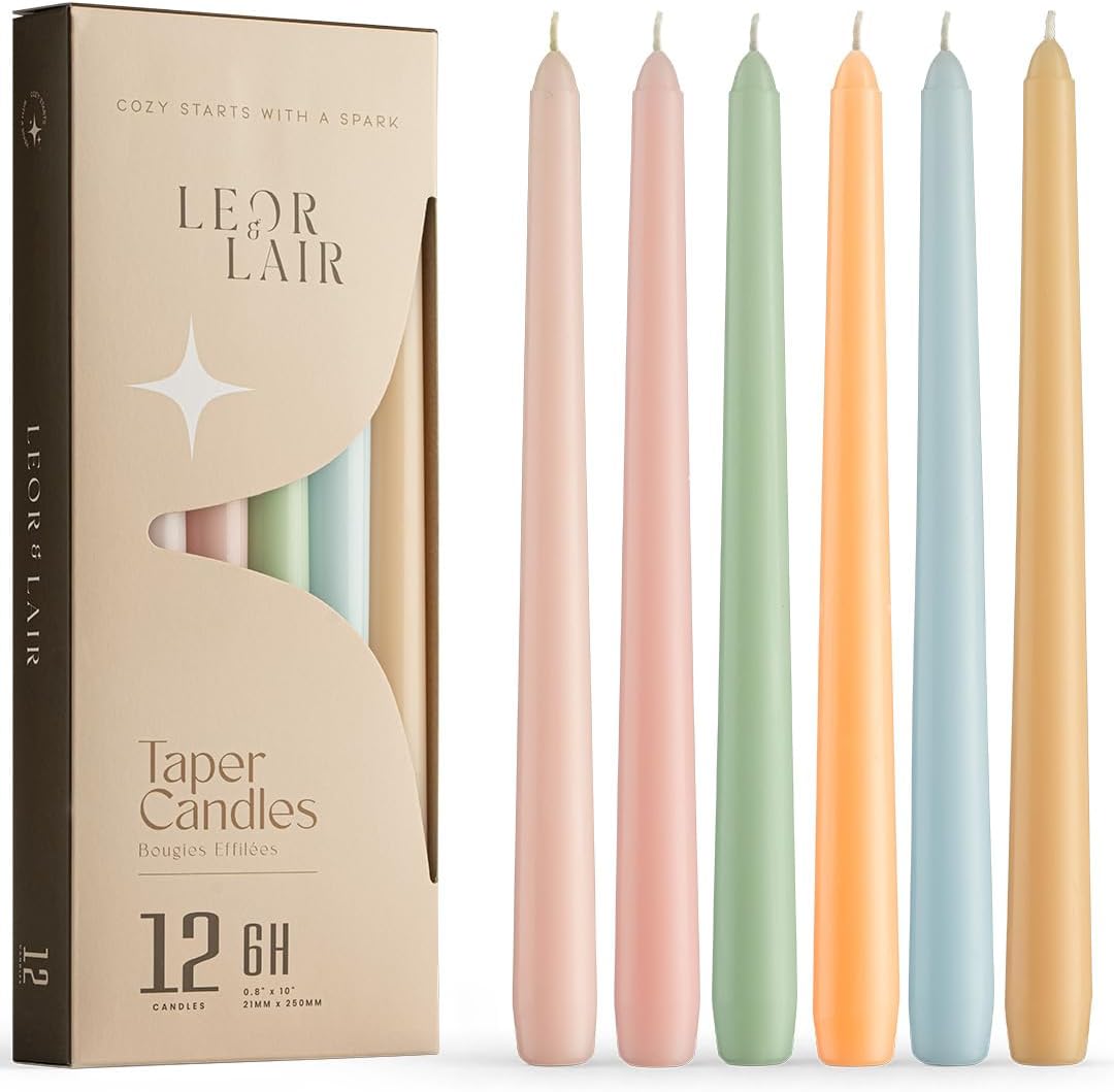 Create a refined seasonal atmosphere with Leor & Lair 10 inch Pastel Taper Candles. This 6 pack features six soft coordinating shades, with two of each color for beautifully balanced arrangements. Colors included are Peach, Purple, Pink, Green, Blue, Beige. Whether styled for weddings, baby showers, or pastel party decor, these pastel candle sticks bring warmth and elegance to every table. Each candle measures 10 inches tall with a 0.8-inch diameter base to fit most standard candlestick holders securely. Designed to burn for over 6 hours, these 10" pastel candlesticks provide steady, clean illumination for extended gatherings and special occasions. Perfect as easter taper candles or decorative spring candlesticks, they enhance Easter brunch tables, holiday centerpieces, and everyday home decor. Their versatile aesthetic complements farmhouse tables, modern minimal settings, and classic entertaining styles alike. Leor & Lair combines seasonal charm with dependable craftsmanship, helping you elevate spring celebrations and timeless gatherings with beautifully coordinated pastel candles.