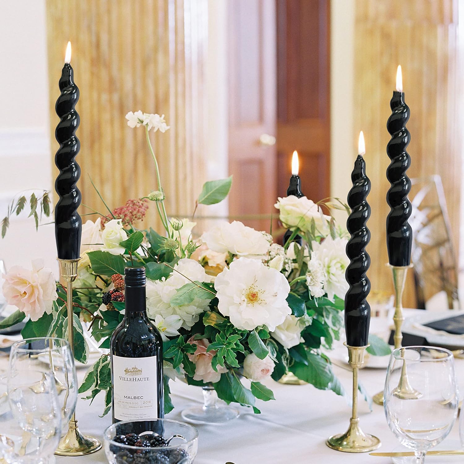 PREMIUM QUALITY MATERIAL CANDLE: The black Thanksgiving Day candle sticks is made of high purity paraffin wax, clean cotton wicks and eco-friendly dyes. It burns without smoke and does not release soot or other pollutants. HANDMADE CANDLES: Each black Thanksgiving Day spiral candles is unique, due to its handmade nature, some wax cream or small bubbles may be seen on the surface, but these will not affect the quality of the candle. BURNING TIME CANDLES: Taper Candle can burn for 6-8 hours, allowing you to enjoy the gentle and intimate light. Choose from a wide range of lengths and colors to meet your specific decor and style preferences. With these varieties, you can effortlessly match the candlesticks to the ambiance you want. SUITABLE FOR EVERY SCENE CANDLES:Our black Christmas Twisted Candlesticks are great for adding ambiance. Whether it's a relaxing bath, a romantic dinner candle, meditation, or a cozy night in, its elegant design makes it ideal for celebrations, self-relaxation, or gifting to loved ones. SAFETY NOTE CANDLESTICKS:To prevent fire and serious injury, light spiral taper candles at eye level. Keep away from drafts and vibrations. Keep out of reach of children and pets. Do not light Christmas candlesticks on or near anything that could catch fire.