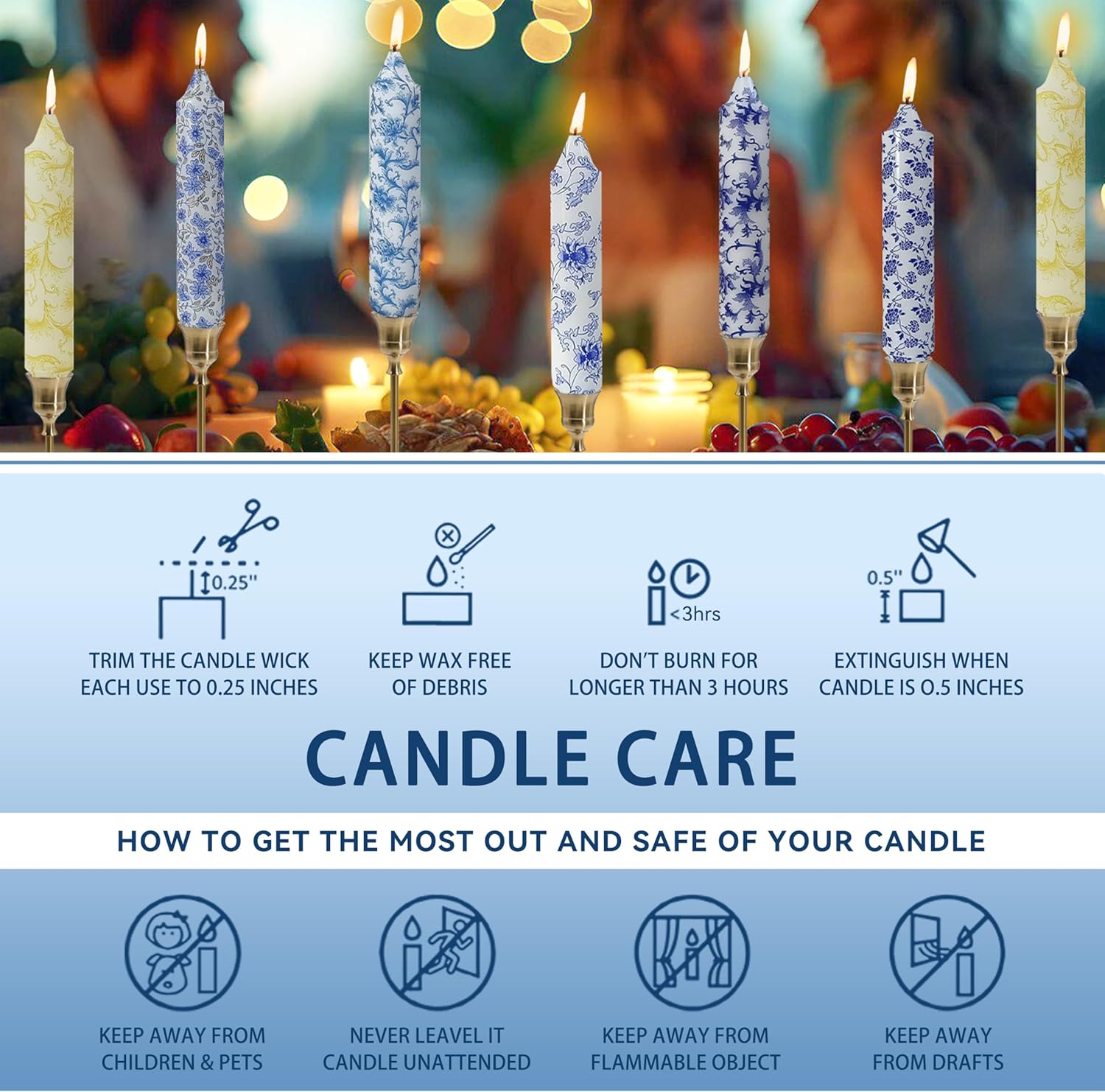 Elegant and simple, these handmade taper candles are perfect for parties and centerpieces. Their soft glow adds a warm ambiance to every occasion. Our candles are made in batches, so please allow some variations in color and size. These differences are a normal part of candle making. 【1】Before burning, always trim the wick to ¼ inch. 【2】When lighting a candle, use long matches or a long-reach lighter. 【3】Never leave a candle unattended. 【4】It is recommended that candles do not burn for longer than four hours and cool for at least two hours before relighting. 【5】Never burn a candle on or near anything that can catch fire. 【6】Keep candles out of the reach of children and pets. 【7】Never touch or move a candle while it is burning or while the wax is liquefied. 【8】Place burning candles at least three inches apart from one another. 【9】Extinguish a candle if the flame becomes too high or flickers repeatedly. Let the candle cool, trim the wick, and check for unwanted drafts before re-lighting. 【11】Use a candle snuffer to extinguish a candle. It’s the safest way to prevent hot wax from splattering.