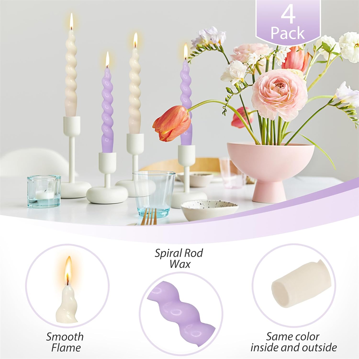 SMOKELESS CANDLES and ENVIRONMENTALLY FRIENDLY: Gedengni candle sticks are made of high purity paraffin, clean cotton wicks, and eco-friendly dyes. The white candles burn smoke-free, without releasing soot or other harmful contaminants, making them a safe and eco-friendly choice for your home. UNSCENTED and ODORLESS CANDLES: Our spiral candlesticks are designed to be non-drip, unless placed in a breezy space or at an angle on the candlestick. The spiral candles are unscented, ensuring your home stays clean from toxic fumes and unpleasant smells. LONG-LASTING BURN CANDLES: Our pastel candlesticks feature a graceful tall taper shape that allows for a long-lasting burn time. You can enjoy their warm glow for hours on end. The twirl candle are 3/4 inch in size, making them suitable for any standard candlestick holder. HANDMADE CANDLESTICKS: Each tapered candle is unique and due to its handmade nature, there may be some wax frosting or small bubbles on the surface, but these don't affect the quality of the candles. Pure handmade candles have different temperatures for each batch, so the color of the candlesticks will also change slightly. UNIQUE TAPER CANDLES GIFT: Our twisted candlesticks feature a wax ingredient and ocean ripple shape, making them suitable for any interior design style from Scandinavian minimalism to colorful boho settings. Our spiral taper candles make the perfect dining accompaniment and a unique gift for lovers, mothers, and friends.