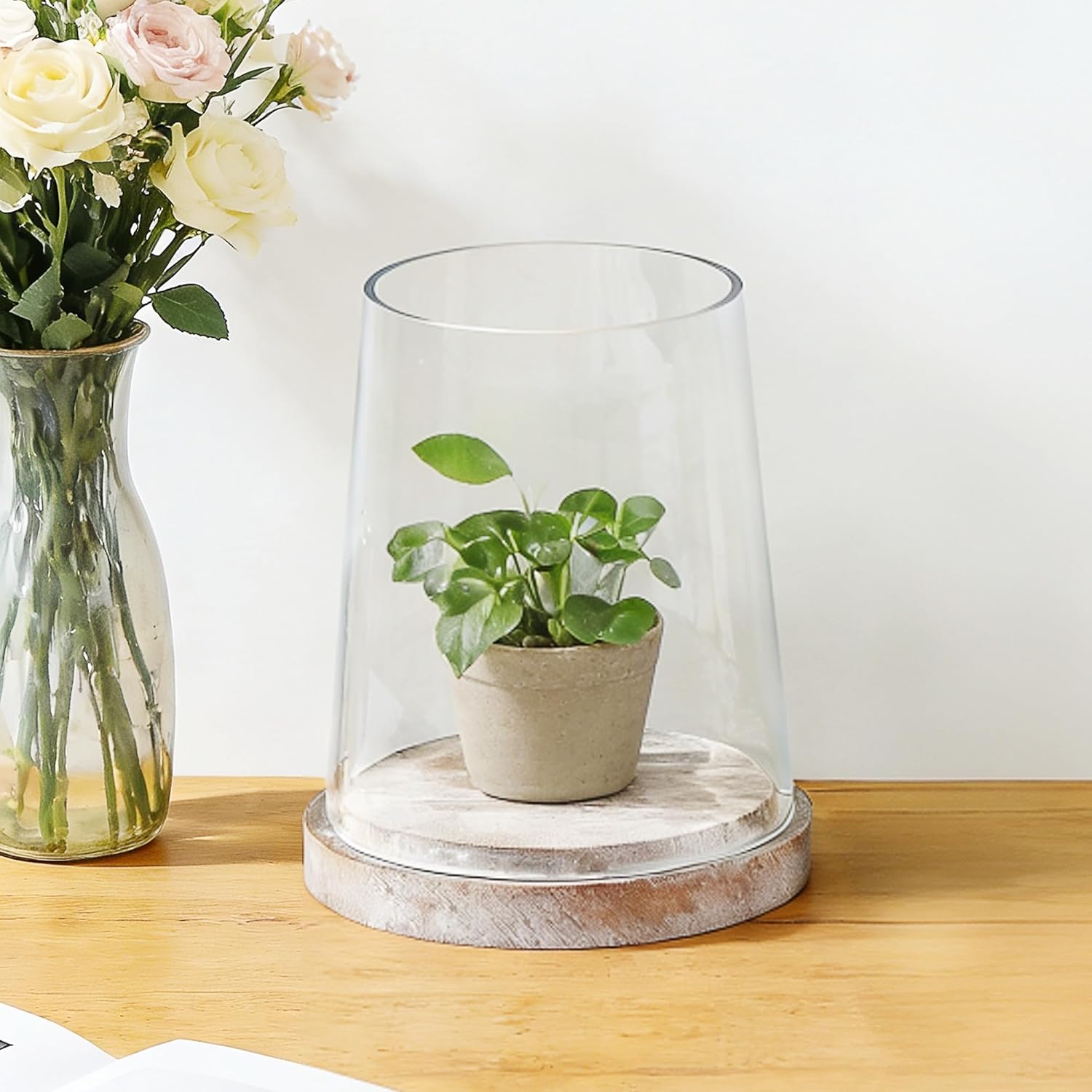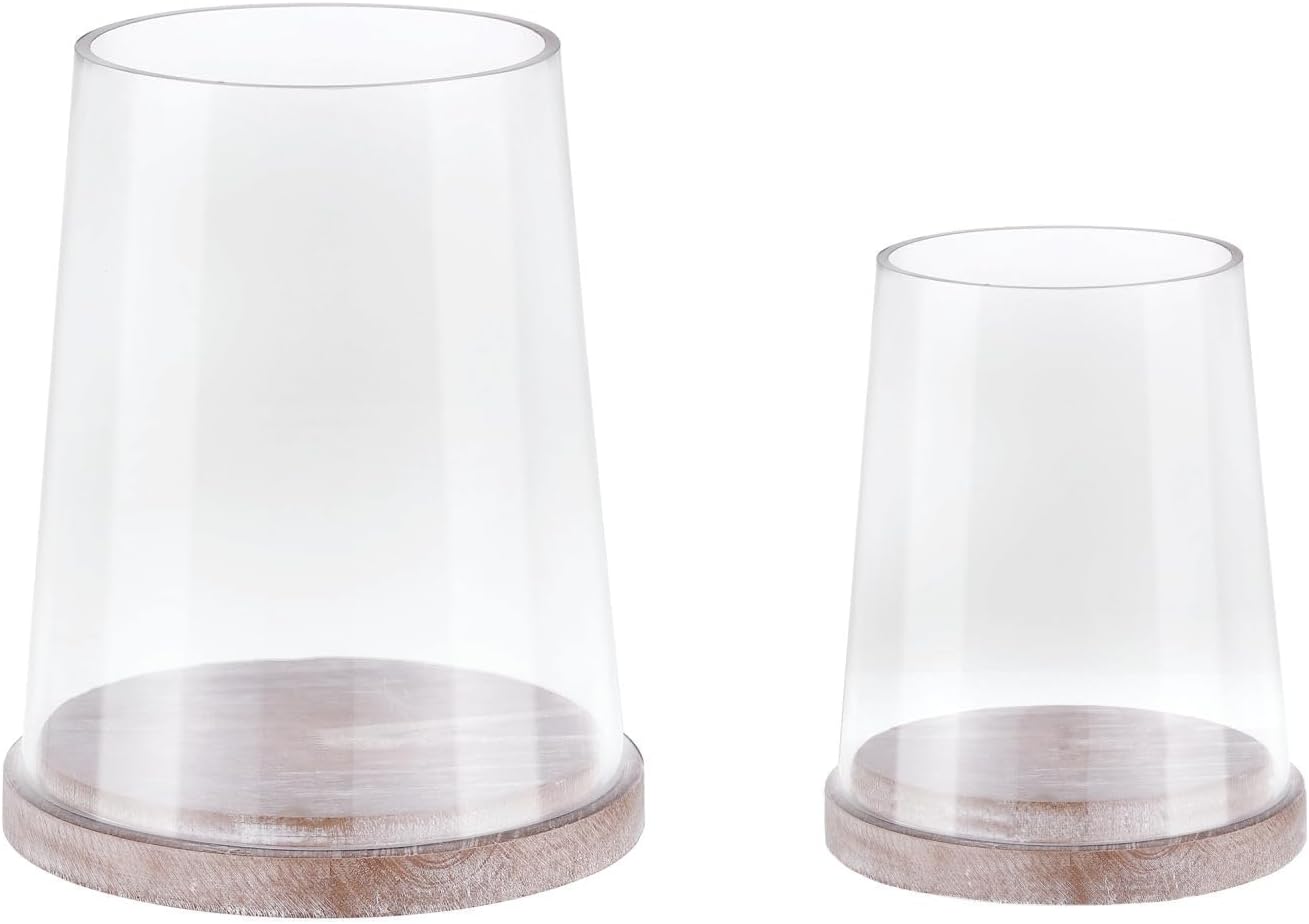 Elevate your home decor with this stunning set of two glass hurricane candle holders. Each piece features a clear cylindrical glass vessel perched atop a rustic wood base, creating a perfect blend of modern elegance and natural charm. The transparent glass allows your candles to cast a warm, inviting glow while providing protection from drafts. These versatile pieces work beautifully as standalone decorative elements or can be styled together to create an eye-catching table centerpiece. The varying heights add visual interest and depth to any display, making them ideal for dining tables, mantels, or side tables. The sturdy wooden bases provide stability while adding a touch of warmth and organic texture to complement any interior style. Perfect for both everyday decor and special occasions, these hurricane holders can accommodate various candle sizes and styles, allowing you to customize your lighting ambiance. The timeless design ensures these pieces will remain stylish through changing seasons and decor trends.
