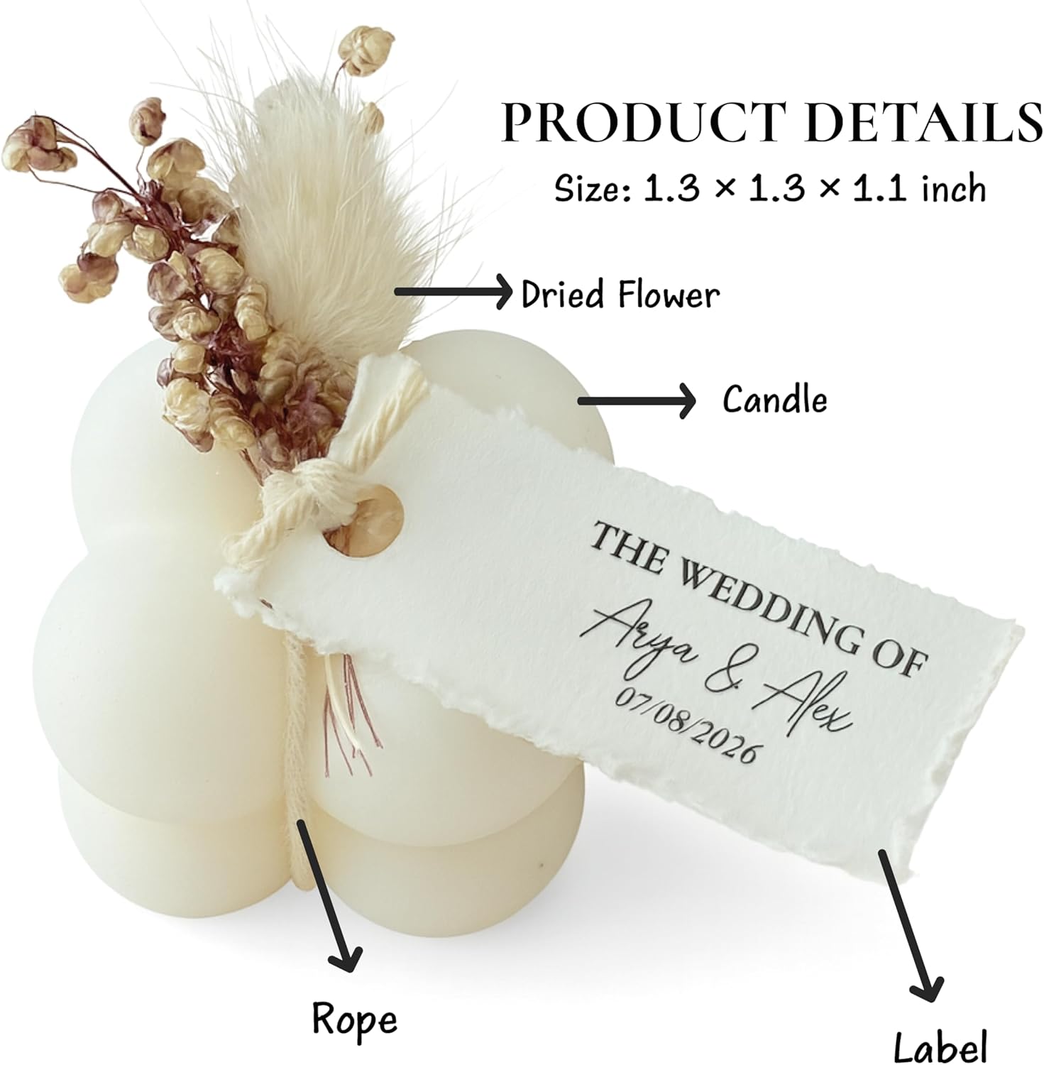 Make your special day unforgettable with our Personalized Bubble Wedding Candle Favor, a unique blend of rustic charm and bohemian elegance. Each mini candle is handmade, decorated with natural dried flowers, and tied with rustic rope. A customizable label lets you add guest names, wedding dates, or messages, making every piece uniquely yours. Perfect for weddings, baptisms, bridal showers, baby showers, anniversaries, or holiday events, these candles are more than just favors – they’re lasting keepsakes your guests will treasure. With their compact size (approx. 1.3 × 1.3 × 1.1 inches), they add elegance to your table setting while serving as thoughtful gifts. Each candle comes fully assembled and ready to gift, saving you time and effort while giving your guests a personalized token of appreciation.