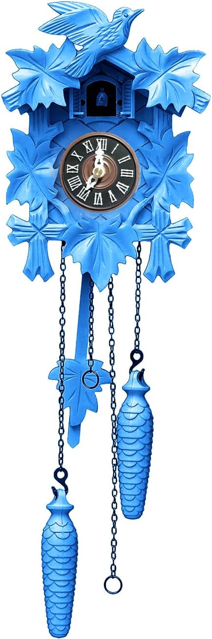 The cuckoo clock has a modern movement, it provides excellent clock accuracy. The dial has Roman numerals Continues the famous Black Forest clocks. The clear numbers are easy to read. You can adjust the volume in the switch panel on the side. If you need silence , you can mute the sound. The quartz movement is powered by 3 C-size batteries and does not require winding (batteries are not included).The night mode is activated automatically at 10 PM. The bird stops coming out from 10 PM to 7 AM (from 22:00 to 7:00). The clock stays silent at night and will not disturb your sleep. The cuckoo appears at the beginning of every hour and indicates the time. The bird comes out, flaps its wings and sings. The number of bird sings indicates what is hour has come. The clock dispaly a small rural house with a cuckoo living under the roof. All the decorations, clock housing and pendulum are carved out of wood. The wooden figures reflect scenes from nature or country life. The clock face, hands, weights, switch panel, and cuckoo are plastic. The wooden pendulum is swinging permanently. Weights and chains are decorative.