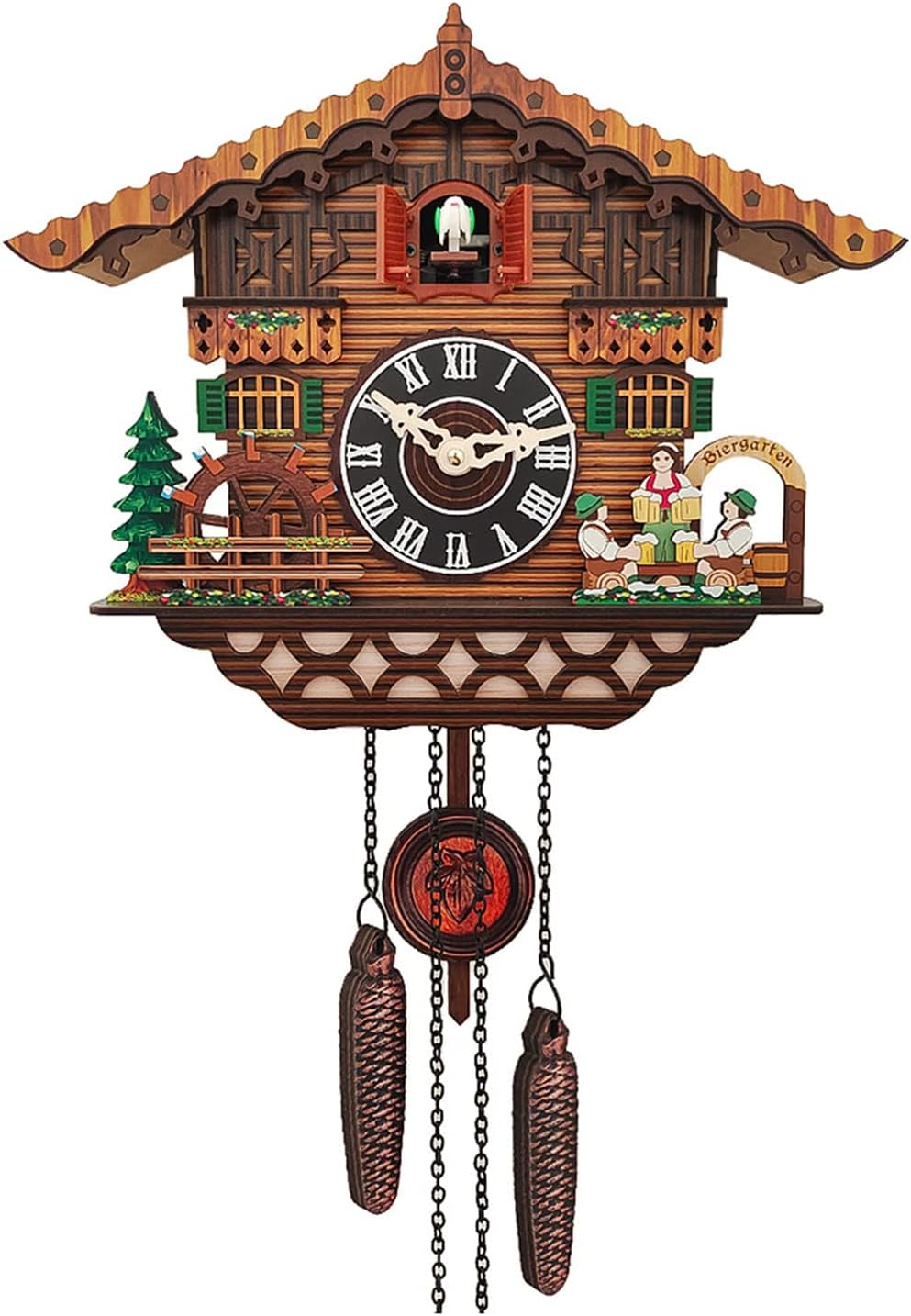 The body of the clock was made of wood and resembled a small rural house. The unusual design proved very popular, and the cuckoo clock has endured for over 300 years. Modern cuckoo clocks improve on the traditional design by including a quartz mechanism, which is battery-operated. Modern cuckoo clocks allow you to adjust the sound volume or it turn off completely, which makes the design more practical. DESCRIPTION: THE CUCKOO: The bird appears each hour, flaps its wings and sings. As the cuckoo sings, you can hear the sound of the forest in the background. The number of indicates the coming hour. NIGHT MODE: The clock stops chiming (from 22:00 to 6:00) and the cuckoo wont't disturb you in the night. VOLUME CONTROL: You can adjust the sound volume with knob on the side panel. If you get tired of the cuckoo, you can turn it off. MOVEMENT: The clock uses a modern quartz movement to provide a good timekeeping. BATTERIES: Three C batteries are required. The batteries are not included. PRODUCT FEATURES: Hand carved decorations; Multi-layer matt lacquer finish; A moving cuckoo bird and swinging pendulum