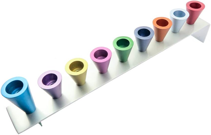 This Hanukkah menorah will add light and joy for you and your family. The menorah is in the shape of an elongated metal frame with colorful cone shaped candle holders. This item is perfect to give at Hanukkah, a Bar or Bat Mitzvah, Shabbat, Jewish Holidays, weddings, a new home, or any other Jewish simcha. About the Artist: Emanuel designs various Judaica products in his Jerusalem based studio The designs are based upon a fusion of traditional motifs and ancient Jewish manuscripts with modern and oriental art. Vivid and harmonious colors as well as a mixture of the old and the new, characterize Emanuel's work. The artist, Yair Emanuel, designs and crafts in many different techniques. Among his techniques are hand embroidery, painting on wood, painting on silk and a variety of metal designs.