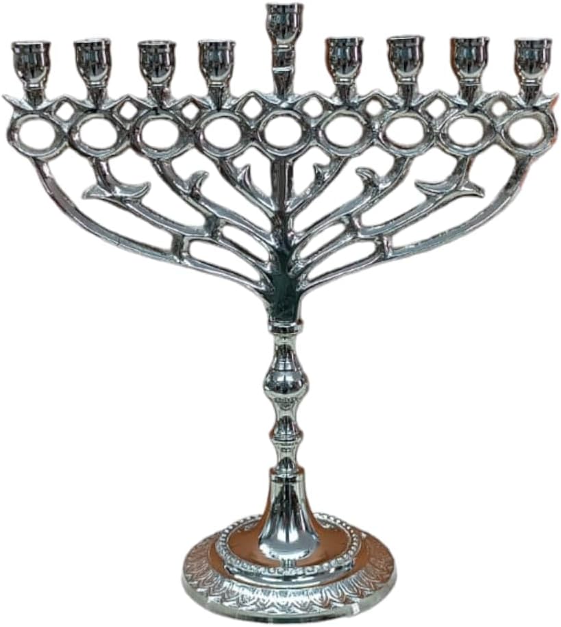 This is special brass / copper color gold authentic Hanukkiah Hanukkah Hanukkia Menorah Pomegranate design 9 Branches Brass Pure Copper Antique Menorah Shiny Brass Menorah designed in the old temple shape beautiful design brass Made - gold color 9 Branches Hanukkah size Height:24CM (9.5") Length: 23 CM (8.5")