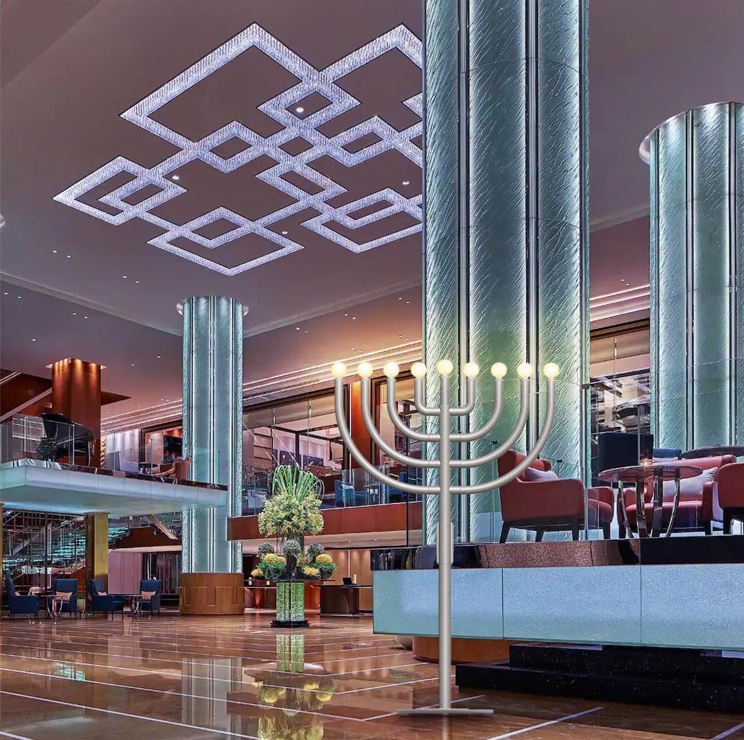 MENORAH – Professionally built Indoor/outdoor Menorah with Automatic lighting feature, A bold traditional style designed with the corporate customer in mind. This Menorah features everything you can ask for. STRUCTURE – Made of powder-coated steel throughout, very simple assembly with screws and tool included. This Menorah comes with a heavy base plate and industrial suction cups under the base for additional safety. The weight balance and the open arm style make this Menorah very safe to withstand an outdoor climate. BULBS – Menorah comes with a set of 9 LED ball bulbs, the bulbs aer very bright while using very little voltage, the sockets are lined with a rubber lip which makes this Menorah suitable for outdoor use even in wet weather conditions. AUTO LIGHTING OPTIONS – This Menorah comes with simple to use lighting settings, this feature allows you to set up the Menorah the 1st night of Hanukkah and the next bulb will go on the next night at the same time, the rest of the bulbs will continue the same pattern, every night an additional bulb. You can also set the lights to any amount of bulbs at any given time. SIZE/WEIGHT – Measures 6’ Tall. Total weight about 55 Lbs.